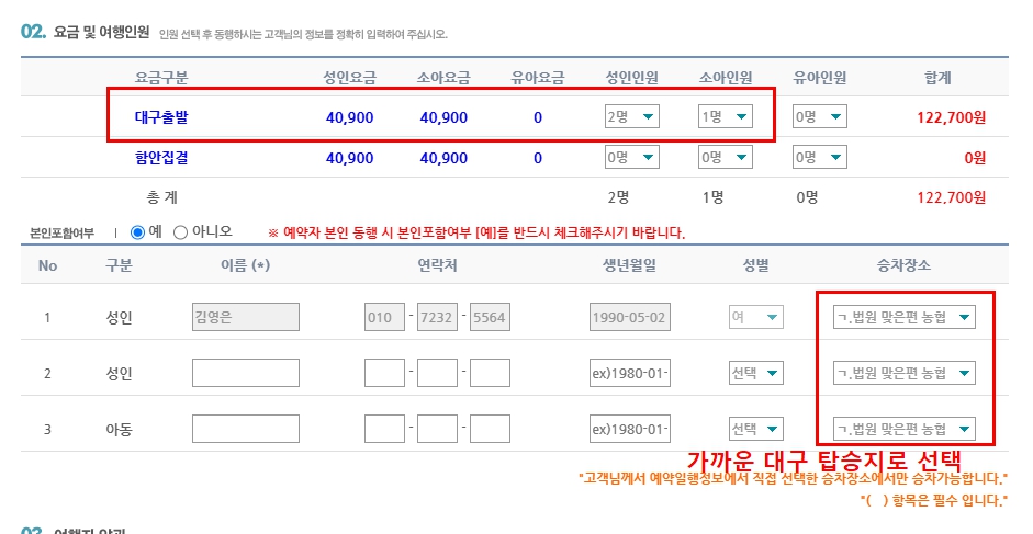 고객님은 대구출발-대구도착 일정이시므로, 대구출발로 성인2, 소아1로 체크해주시면 됩니다.
