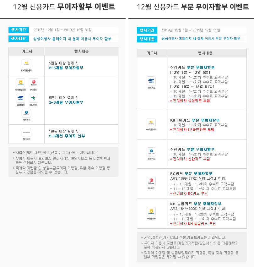 안녕하세요! 삼성여행사입니다. 삼성여행사 홈페이지 내 예약 후 카드결제시 아래와 같이 무이지할부 이벤트를 진행하고 있으니 확인하시고 혜택 받으세요~ ◎ 접속방법 - PC / 모바일 / 어플 접속 > 예약 > 결제~! 1. PC : www.123tour.co.kr 2. 모바일 : m.123tour.co.kr 3. 어플 : 삼성/LG 안드로이드 어플 다운 클릭>>> https://goo.gl/icA14y 애플 아이폰 어플 다운 클릭>>> https://apple.co/2OSXp8v ![]() ◎ 유의사항 - 사업장(법인, 개인), 체크, 선불, 기프트카드는 제외 됩니다. - 무이자 이용시 다른 혜택(각 카드사 혜택)과는 중복 적용되지 않습니다. - 본 이벤트는 12월 한정이며 어플리케이션 접속시 애플 아이폰 카드결제는 현재 준비중으로 PC 접속 후 결제 부탁드립니다~ 감사합니다. |