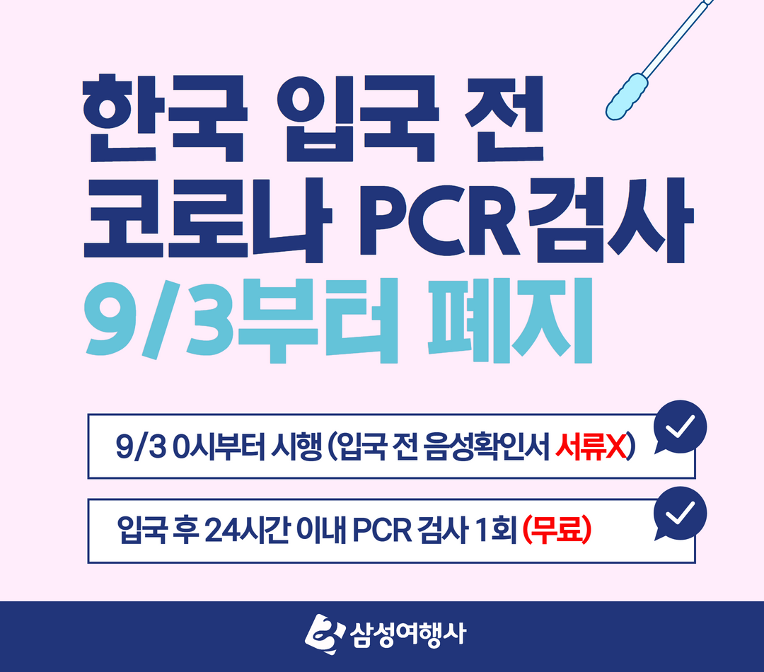 정리 하자면 한국 입국 전 꼭 필요했던 신속항원검사 및 PCR검사가 9/3 00시부터 폐지되어 앞으로는 한국 입국 후 24시간 이내 주거지 관할 보건소에서 PCR 검사 1회(여권 지참 시 무료)만 하시면 되니 참고 부탁 드립니다. 감사합니다.
