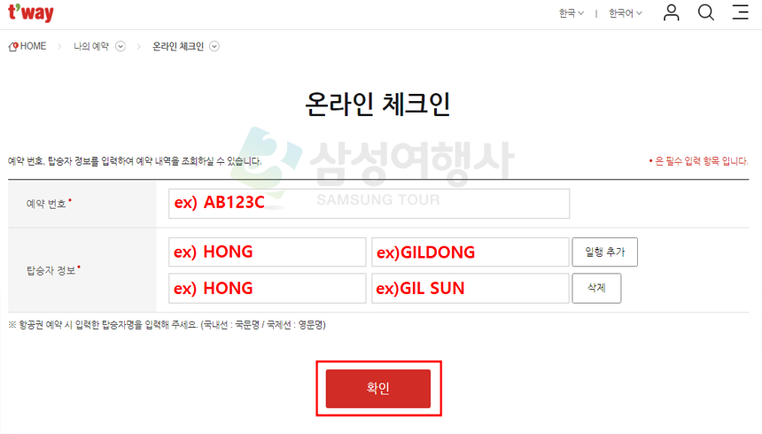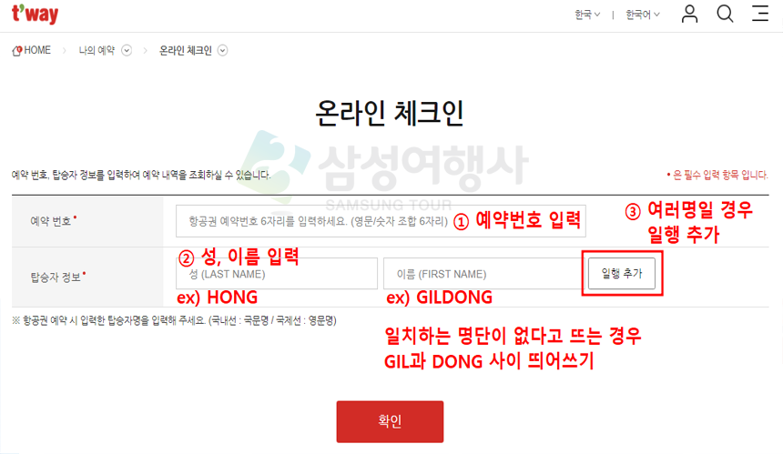 일치하는 탑승객 명단이 없다고 뜨는 경우 이름 사이 "띄어쓰기" 해보기 ex) GILDONG > GIL DONG