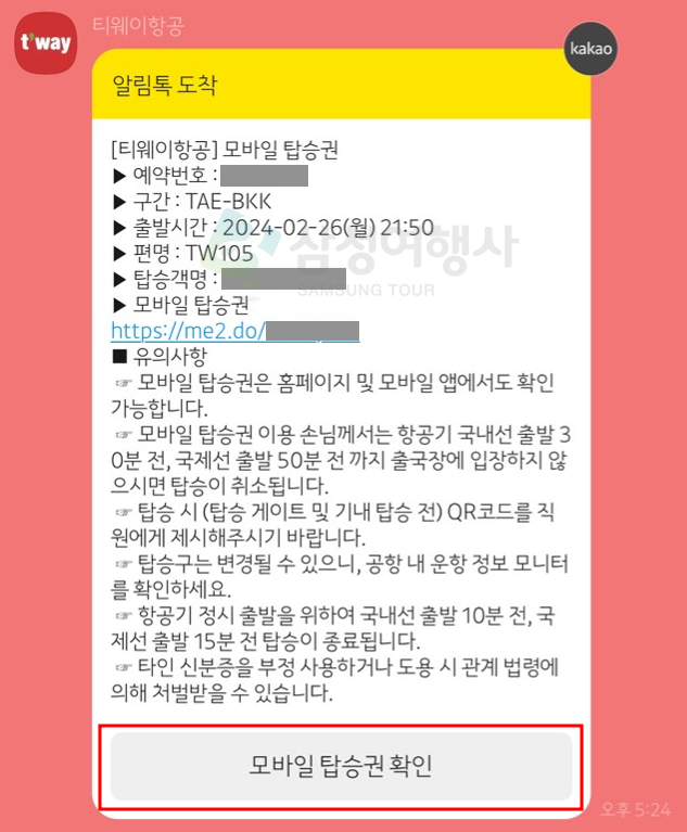 10. 카카오톡으로 발송된 메세지 내 모바일 탑승권 확인 클릭!