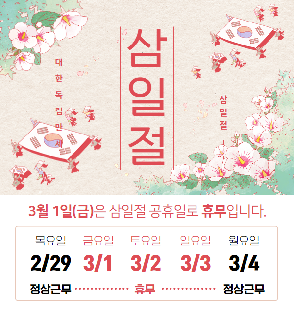삼일절 휴무일 : 24. 03. 01(금) ~ 24. 03. 03(일) 24:00 정상 근무일 : 24. 03. 04(월) 09:30부터 정상영업