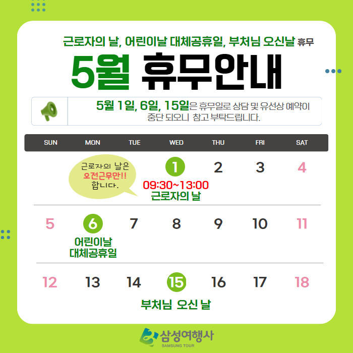 안녕하세요 삼성여행사 입니다. 5월 가정의 달을 맞아 아래와 같이 휴무일을 공지합니다.