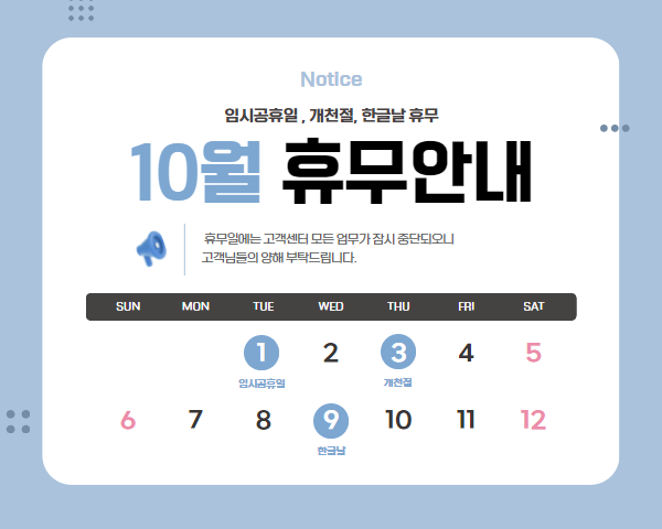 휴무일 : 24. 10. 1 (화) 전일 휴무일 : 24. 10. 3 (목) 전일 휴무일 : 24. 10. 9 (수) 전일