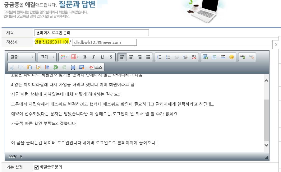 1.여행상품 결재를 위해 크롬에서 익스플로러로 옮겨서 사이트 재접속함 2.아이디 찾기에서 아이디가 26501110으로 나옴 3.찾은 아이디로 비밀번호 찾기를 했더니 존재하지 않는 아이디라고 나옴 4.없는 아이디라길래 다시 가입을 하려고 했더니 이미 회원이라고 함 지금 이런 상황에 처해있는데 대체 어떻게 해야하는 걸까요;; 크롬에서 재접속해서 패스워드 변경하려고 했더니 패스워드 확인이 필요하다고 관리자에게 연락하라고 하던데... 예약이 접수되었다는 문자는 받았습니다만 이 상태로는 로그인이 안 되서 뭘 할 수가 없네요 가급적 빠른 확인 부탁드리겠습니다.