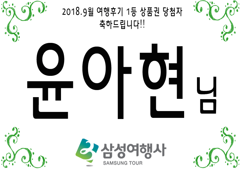 서늘한 바람과 함게 코끝이 시리기 시작한 10월이 다가왔습니다. 고객님들 모두 풍성한 한가위 잘 보내셨는지요? 곳곳에 낙엽이 물들기 시작하는데, 삼성여행사와 좋은 곳에서 좋은 사람과 좋은 추억 만드는 가을이 되셨으면 좋겠습니다 :) 이번달 당첨자는 아래와 같습니다. ★1등 백화점 상품권(3만원) 당첨자 : 윤아현님 010-6664-**** ★1등 후기 : www.123tour.co.kr/WBBS_2012/View.asp ★무료영화예매권 당첨자 : 총 10명 ![]() 본격적인 당첨되신 모든 분들 진심으로 축하드립니다^^ 상품권은 개별연락드리며, 영화표는 영화후기 등록 당시 연락처로 보내드립니다. 감사합니다 ^-^ |