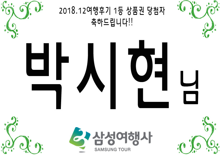 어느덧 2019년이 밝았습니다. 많은 결실을 맺으셨나요?^^ 2019년도 황금돼지해에는 삼성여행사 고객님들이 바라는 모든 일이 성취되시기를 기원하겠습니다. 얼마 남지 않은 올해, 뜻하는 바 신년해에는 의미있고 토실토실한 결과들이 많은 해가 되길 진심으로 바라며, 당첨자는 다음과 같습니다. ★1등 백화점 상품권(3만원) 당첨자 : 박시현님 010-5514-**** ★1등 후기 : www.123tour.co.kr/WBBS_2012/View.asp www.123tour.co.kr/WBBS_2012/View.asp ★무료영화예매권 당첨자 : 총 8명 ![]() 당첨되신 모든 분들 축하드립니다^^! 상품권은 개별연락드리며, 영화표는 여행후기 등록 당시 연락처로 보내드립니다. 2018년에도 함께 해주셔서 감사의 마음 전하며, 2019년에도 삼성여행사와 함께 해주세요 감사합니다 *^^* |