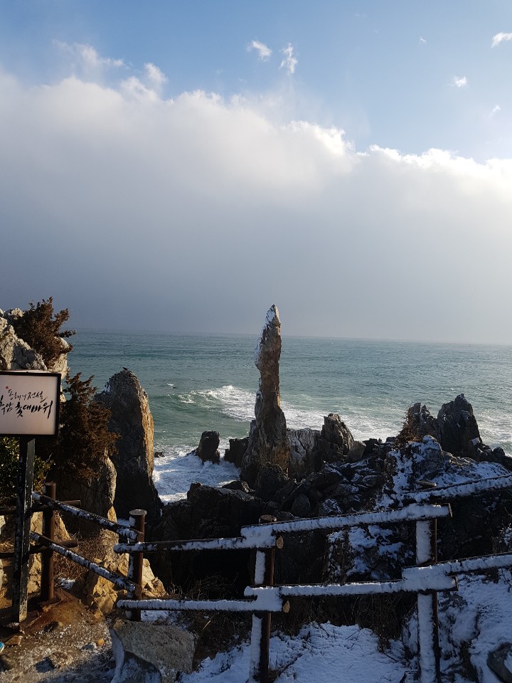 눈쌓인 촛대바위와 바다가 어우어져 정말 아름다웠습니다.