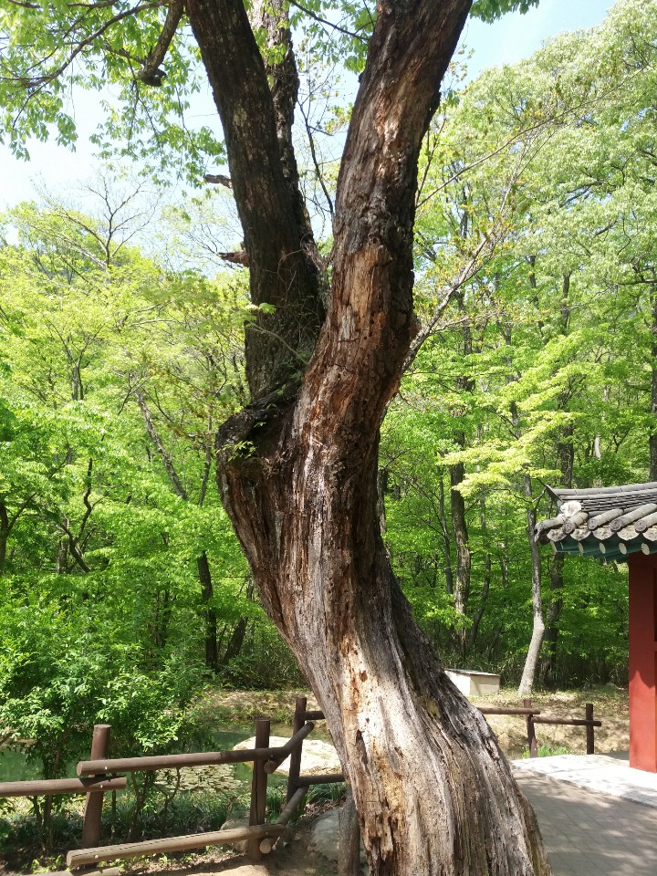 버스에서 내려 산책길을 20분정도 걸어야 해인사입구에 도착합니다. 시원한 물소리, 새소리를 들 으며 걸으면 이렇게 나이든 고목들이 많이 보입니다. 나무는 나이가 들어도 고풍스러워지는 것 같 습니다.