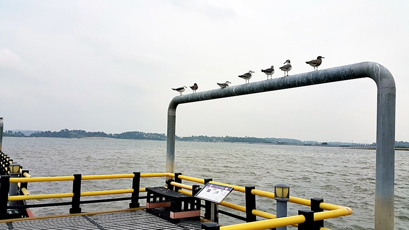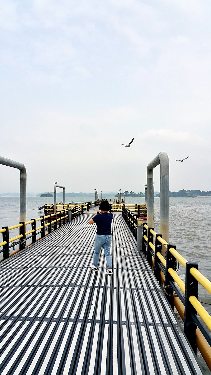 이곳은 경남 사천시 용현면 금문리에 위치한 갯벌 부잔교(浮棧橋) 탐방로인데 바다위에 나즈막하게 물에 뜨는 다리를 만들고 수면의 높낮이에 따라 다리가 위아래로 자유롭게 움직여 썰물때 갯벌이 드러나면 갯벌 탐방을 할 수 있고 밀물때 바닷물이 차면 바다 가운데에 설 수 있다. 우리가 방문한 오전시간대에는 물이 차있어 바다위 부잔교 끝까지 150여미트를 시원한 바람과 갈매기들의 배웅을 받으며 걸었다.