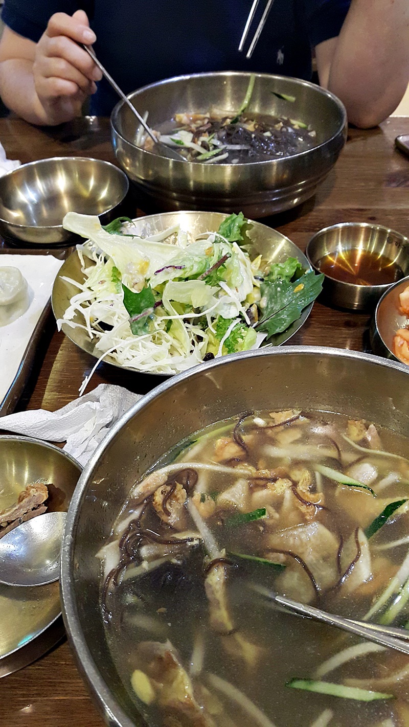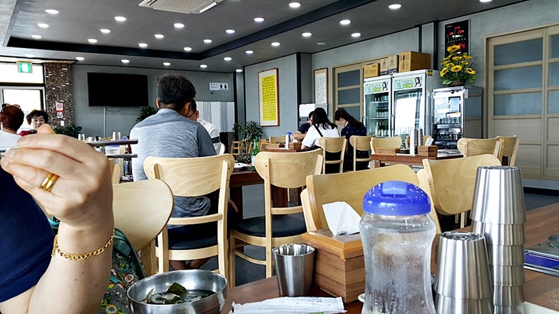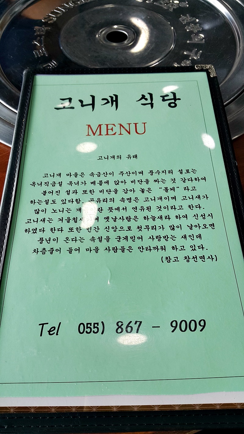 바다케이블카를 나와 삼천포대교를 지나 남해로 가는 도로변, 남해군 창선면 동부대로 2589에 위치한 팬션을 겸하는 식당인데 식당 이름이 특이한데 메뉴판에 그 유래를 적어 놓았다. 옛부터 신성시 하는 고니새들이 많이 노니는 개울이란 뜻이란다. 오늘 점심메뉴는 가이드님이 추천하는 남해의 대표적인 토속음식인 멸치쌈밥과 멸치회를 주문했다. 쌈밥은 짜지않고 부드러워 익숙치 않은 음식이지만 그렇게 거부감은 없었고 멸치회는 깔끔하고 쌈박한 느낌을 주었다. 특히 이 식당은 인공조미료는 전혀 사용하지 않는다고 한다. 대구를 출발 아침일찍 시작한 여행이라 바닷가를 바라보며 먹는 식사는 꿀맛이었다.