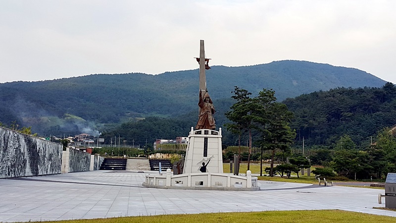 관람을 마치고 영상관 뒷쪽으로 나가니 관음포 앞바다가 바라 보이는 전망터가 있고 오른편 호국광장에는 순국의 벽, 이순신 장군 동상등이 있었다.