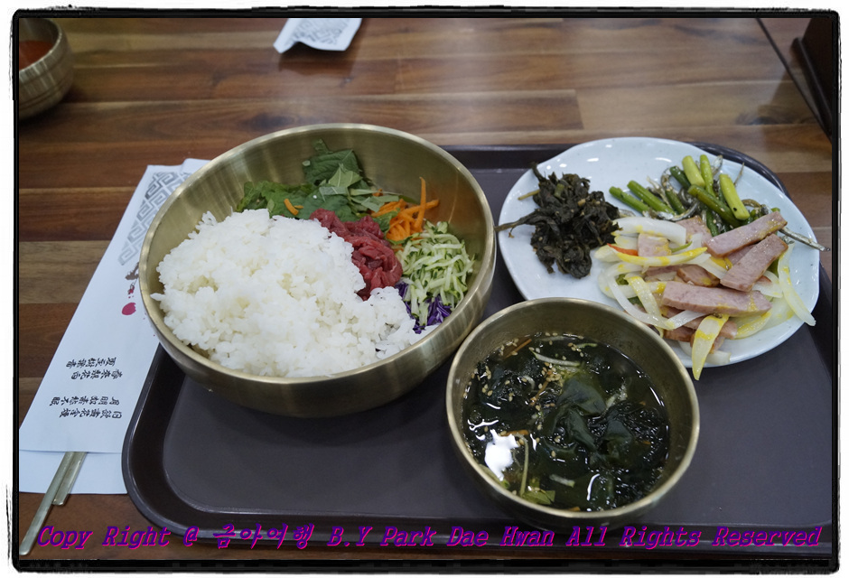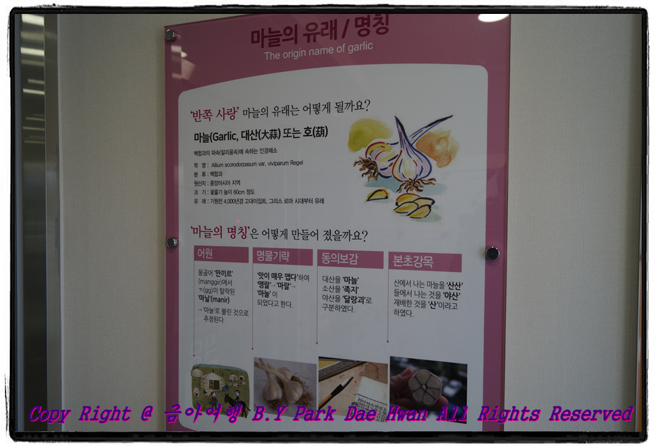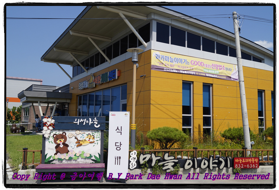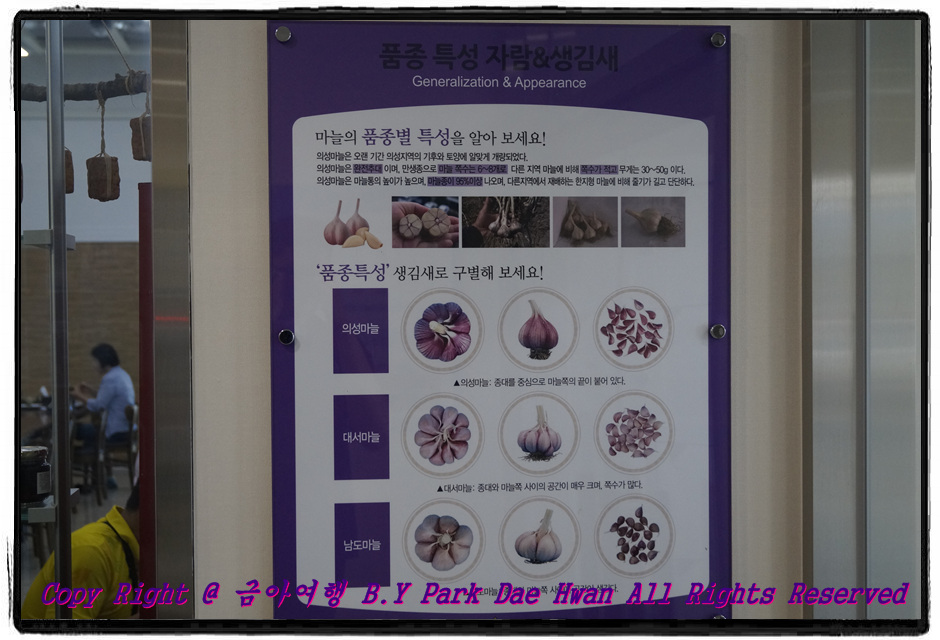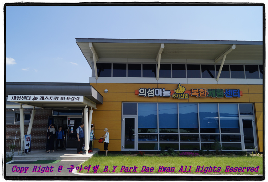 빙계계곡 출발한지 26분만인 12시51분에 의성마늘 복합센터에 도착하였습니다. 이 곳에서 점심식사 및 마늘빵 만들기 체험을 합니다! 식당에 들어서니 학교급식 먹는 것 처럼 미리 준비된 육회비빔밥 재료, 밥, 반찬, 오이냉국 등이 준비되어 있었습니다. 밥, 반찬은 자율배식이어서 참 좋았습니다 ㅎㅎ 반찬은 나물, 의성마늘햄볶음, 마늘쫑멸치볶음, 마늘지 등 마늘반찬들이 많았습니다..^^ 점심으로 먹은 마늘소스육회비빔밥 이었습니다. 기존에 먹던 육회비빔밥과는 비교할 수 없을 정도로 너무나도 맛있었습니다..^^ 또한 식당에 도착하기 전 가이드님께서 육회못드시는 고객님은 식당에서 육회를 익혀서 해준다는 이야기를 해주셔서 가이드님이나 식당이나 모두 고객의 입맛까지 배려를 해주시는구나 생각이 들었습니다. 마늘의 유래와 명칭에 대한 설명입니다. 마늘은 백합과의 파속에 속하는 인경채소로써 백합과에 속하며 원산지가 중앙아시아 지역이라고 합니다. 유래는 기원전 4,000년경 고대이집트, 그리스 로마시대부터 유래하였습니다! 마늘 품종 특성 자람 및 생김새에 대한 설명입니다. 의성마늘은 만생종으로 마늘 쪽수는 6~8개로 다른지역 마늘에 비해 쪽수가 적고 무게는 3~50g 입니다. 마늘통의 높이가 높으며 마늘종이 95% 이상 나옵니다..^^ 점심식사를 한 후 13시30분경에 식당 바로 옆에 있는 의성마늘복합체험관에서 마늘빵 만들기 체험을 하였습니다. 디저트 체험입니다! 소스재료는 버터, 연유, 설탕, 마요네즈, 마늘한톨이 들어가있습니다..^^ 파슬리도 옆에 있습니다. 설명하시는 분의 설명을 잘 듣고 소스를 바르고 파슬리를 올린 후 다시 고루고루 발라주었습니다..^^ 너무 많이 바르면 마늘빵이 눅눅해지니 적당히 발라주었습니다 ㅎㅎ 적당히 바르고 오븐기에 마늘빵이 맛있게 구워지는 동안 의성마늘에 대해 설명을 들었습니다. "의성마늘은 끝이 뾰족하고 중간에 심과 줄기가 있습니다. 6~10쪽이며 수입산은 엄청크고 15쪽 입니다. 의성마늘은 3~50g이며 한접은 3~5kg 입니다. 의성마늘은 매운맛이 작고 찰기가 없습니다. 마늘은 바로 까서 냉동보관 또는 김치냉장고에 보관하는 것이 좋습니다. 흑마늘은 실온에 두어도 곰팡이가 피지 않습니다" 등의 이야기를 해주셨습니다. 마늘빵을 만들고 오븐에 들어간지 8~10분만에 잘 구워진 마늘빵이 나왔습니다..^^ 직접 만든 마늘빵을 포장해서 가져가실 수도 있습니다..^^ 점심식사 및 체험을 마치고 14시11분경에 의성마늘체험관을 출발하였습니다. 의성마늘체험관 출발한지 11분만인 14시22분경에 의성전통시장에 도착하였습니다. 15시에 출발한다는 가이드님의 안내를 듣고 하차하였습니다. 제가 의성여행했던 이 날이 마침 장날이라 시장분위기가 활기찼습니다!