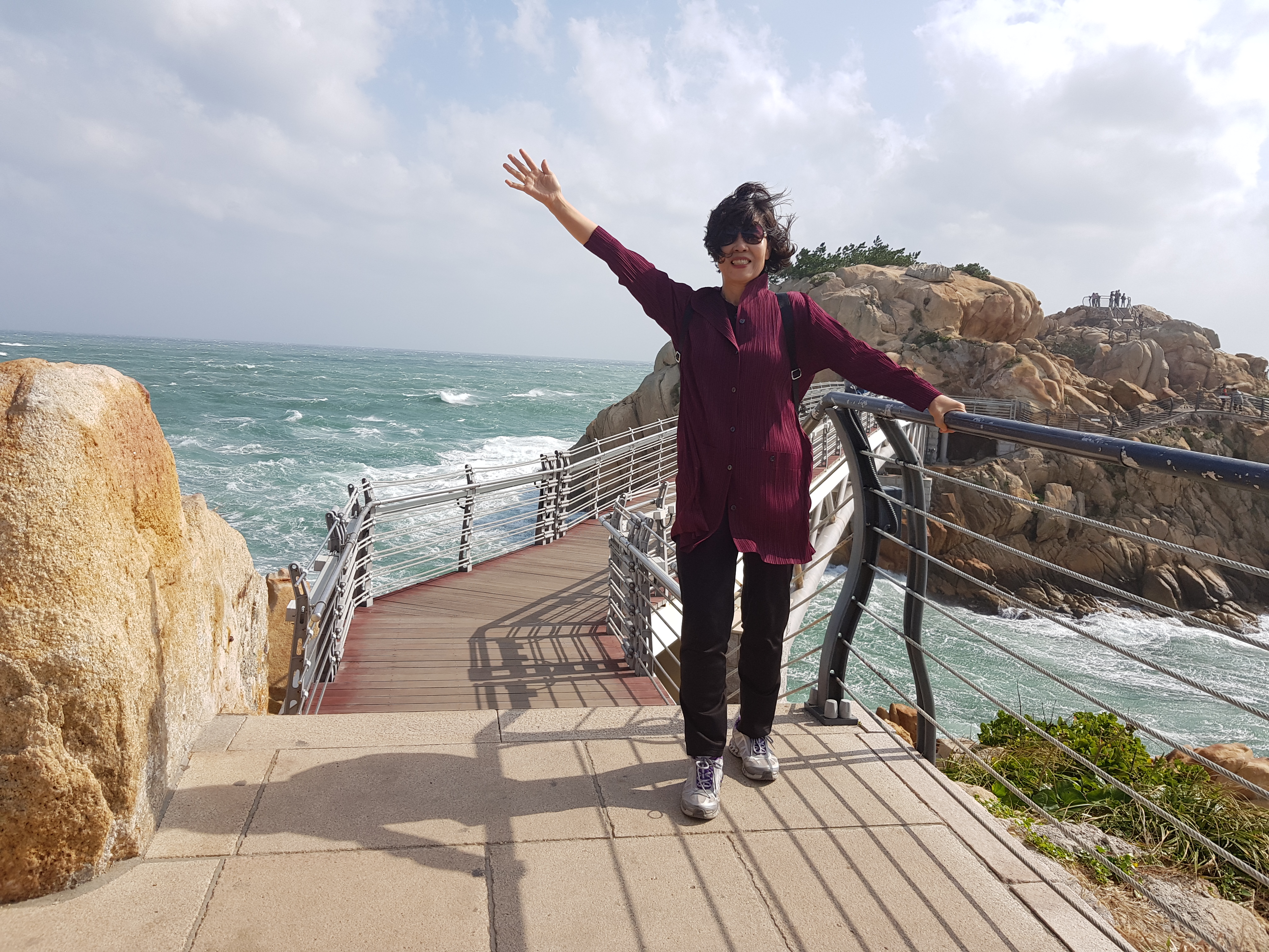 2019.10.12일 토요일 태풍이 대한민국을 비켜간다는 일기예보를 뒤로하고 부푼 마음으로 우리 일행은 버스에 올랐다 특가로 떠나니 호주머니 부담도 줄어서 더욱 좋았다 코스가 알차서 우리팀과 생각이 같은지 많은 사람이 동행하게 되었다-빈자리가 2개 였던가 오늘의 코스튼 울산 대왕암과 국가정원으로 승격된 십리 대나무숲 포항 보경사를 둘러 저녁에는 죽도시장 물회와 매운탕으로 저녁으로 마무리 처음본 얼굴이지만 친근감을 주는 김경애 가이드의 안내에 따라 사전 설명과 안전 수칙을 들으며 모두들 즐거운 여행에 들뜬 모습의 동심으로 돌아간듯하다 나 또한 함께한 낮선 사람들과 눈인사를 나누고 안전벨트 메며 출~발 첫여행지 대왕암에 도착하니 바람이 장난 아님을 파도가 말해줬다 단체사진 찍으려 플렌카드 들고 시도하다 머리는 산발로 -오마이갓 불행중 다행으로 사진은 예쁘게 나옴