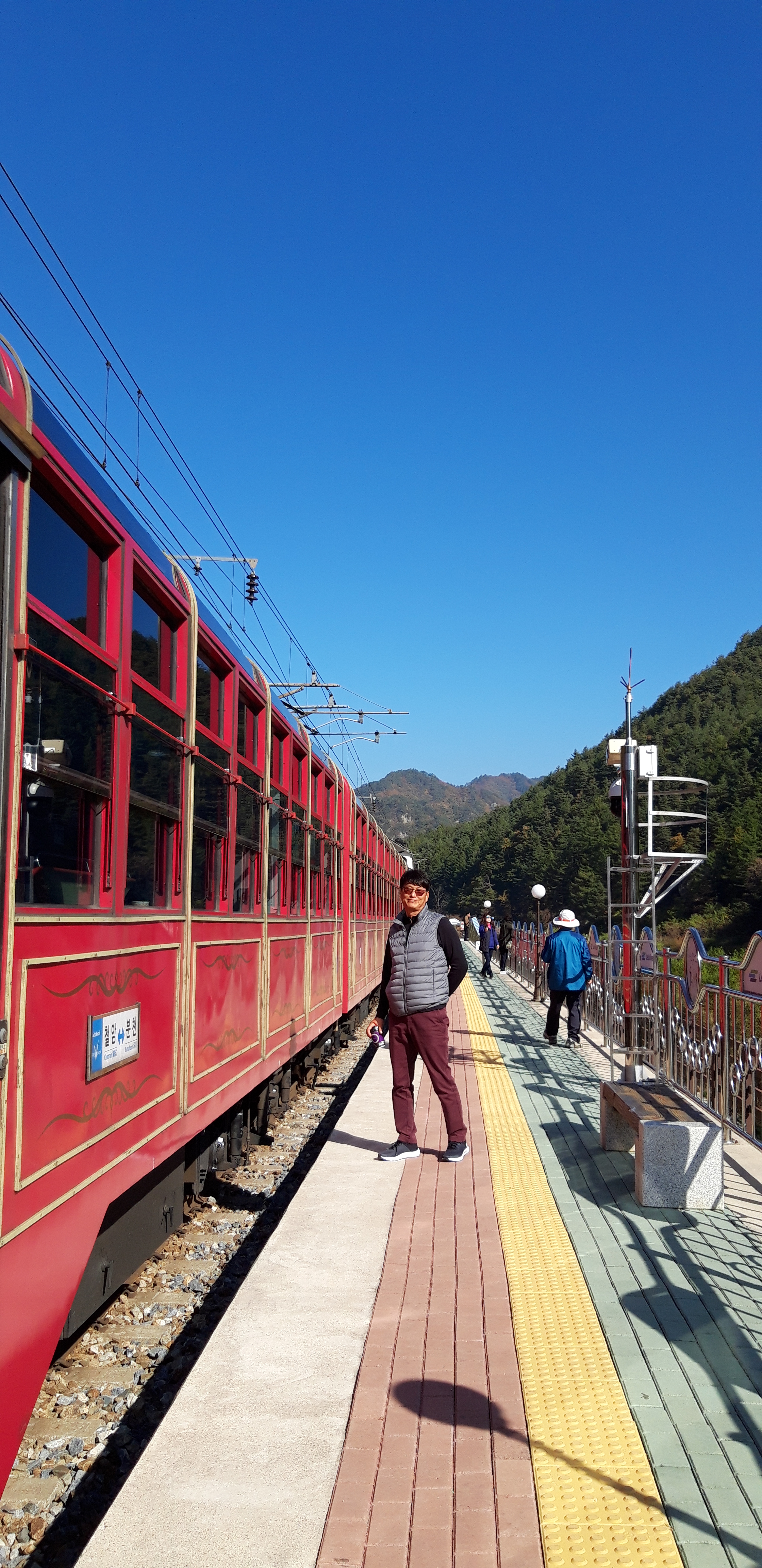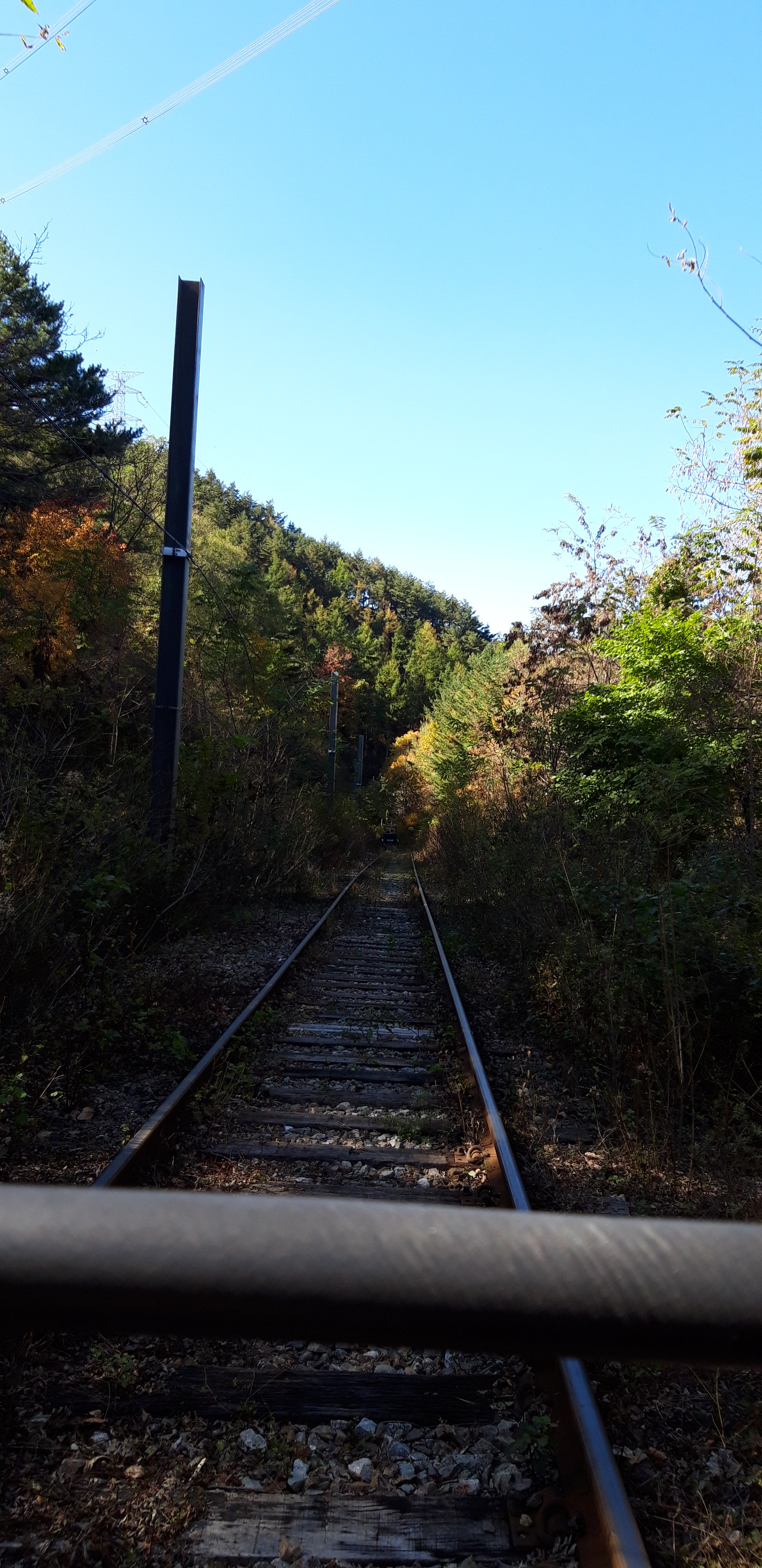 전국에서 제일 작은 양원역도 보고  승부역에 내려서 경치도 보고, 철길에서 사진도 찍고, 파란하늘과 울긋불굿단풍은 아름다웠다