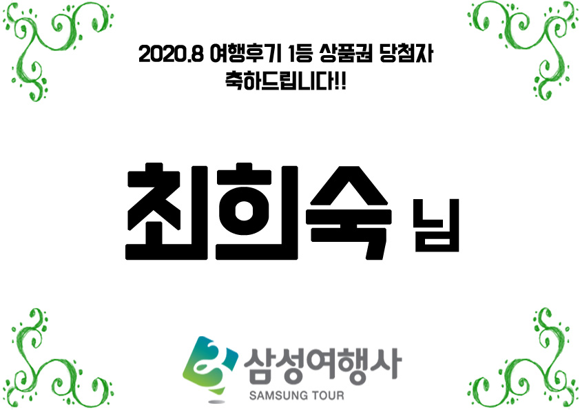 뜨거웠던 여름이 지나가고, 감성돋는 가을이 다가왔습니다! 선선한 바람이 불어 산책하기 좋은 날씨와 북천코스모스를 시작으로 여러가지 가을상품이 진행되니 많은 문의 부탁드립니다ㅎㅎ 다가오는 추석도 풍성하게 보내시길 바라며 8월 여행후기 당첨자 발표하겠습니다^^ ★1등 백화점 상품권(3만원) 당첨자 : 최희숙님 010-9544-**** ★1등 후기 : http://www.123tour.co.kr/WBBS_2012/View.asp?TB_SEQ=13161&BD_CODE=SS004&Page=1 ★스타벅스 아이스 아메리카노 당첨자 : 총 5명 ![]() 당첨되신 모든 분들 진심으로 축하드립니다! 상품권은 개별 연락드리며, 기프티콘은 여행후기 등록 당시 연락처로 보내드립니다. 감사합니다^^ |