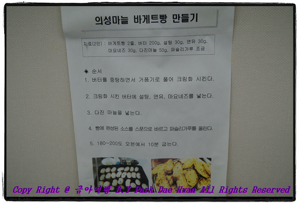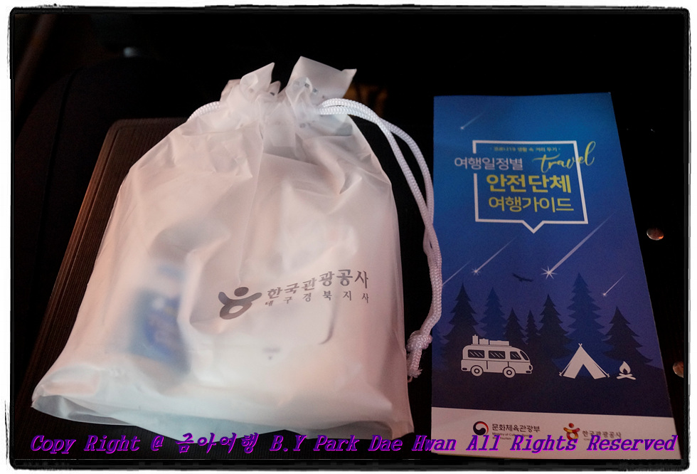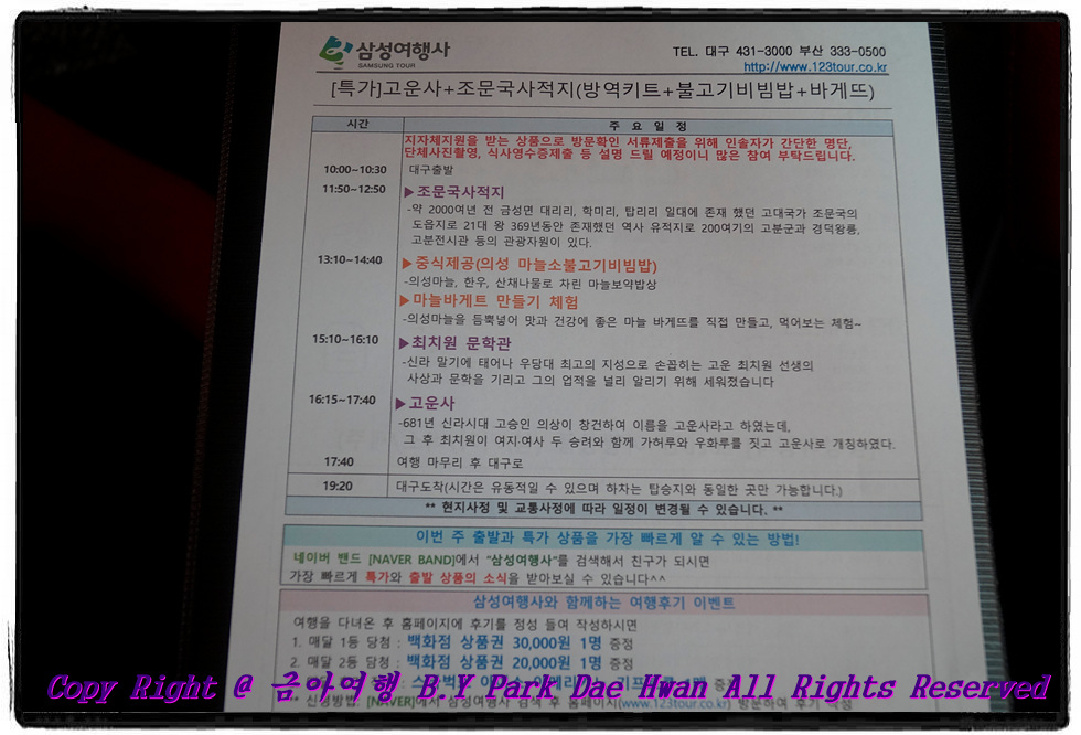 안녕하십니까? 버스타고 여행을 즐기는 사나이 "박 대 환" 입니다. 평소 버스타고 여행을 즐기는 저였지만 올해는 코로나19 여파로 인해 각종 모임, 행사 등이 취소되고 사회적 거리두기 등으로 2020년 한 해는 여행을 정말 많이 가지 못하였습니다. 어느덧 가을이 되고 "하늘은 높고 말은 살찐다" 는 천고마비의 계절인 가을에 어디라도 여행을 떠나봐야 겠다는 생각이 들었습니다. 어느 여행사를 통해서 가볼까? 하고 고민하던 중 문득 작년 여름에 의성 당일치기로 빙계계곡, 의성전통시장, 사촌가로숲 코스로 갔던 삼성여행사가 생각이 나서 바로 인터넷 검색하였습니다. 인터넷 검색 후 여행상품들을 쭉 보니 지자체지원상품, 당일여행상품, 숙박상품 등 다양한 여행상품이 있었지만 제 눈에 들어온건 바로 의성이었습니다! 작년에 의성 갔을때도 좋았던 기억이 있어서 올해는 어느 여행지로 가는가 보았더니 제가 한번도 가보지 않은 조문국사적지, 최치원문학관, 고운사 코스가 있었습니다! 28,900원에 의성마늘소불고기비빔밥 제공 및 마늘빵 만들기 체험, 최치원문학관 입장료까지 포함되어 있고 한국관광공사 대구경북지사에서 제공해주는 1만원 상당의 방역키트(세탁가능한 입체마스크 + 손소독제 + 물티슈)도 제공되었습니다. 이번 여행은 나 혼자가 아닌 어머니 모시고 같이 가보아야 겠다는 생각에 어머니 모시고 11월07일에 의성여행을 다녀왔습니다..^^ 바쁜 일상을 보내다가 이제 생각나서 늦게나마 후기를 작성하였습니다! 그럼 본격적으로 여행후기 시작해보겠습니다. 11월07일 오전 09시45분에 "대구 법원 건너 농협 앞" 정류장에서 버스를 탑승하였습니다. 제가 하루종일 이용하게 될 드림관광 7959호 입니다. 이 날 가이드님으로는 삼성여행사 이주현 가이드님께서 수고해주셨으며 이 날 하루 안전운행해주실 승무사원님께서는 드림관광 조성철 승무사원님께서 수고해주셨습니다! 버스 탑승하기 전 가이드님께서 손목 쪽에 열체크 하신 후 온도까지 작성하셨으며 손소독제 꼭 해달라는 부탁도 하셨습니다. 버스는 10시에 출발하여 반월당 현대백화점, 구 광장코아, 성서홈플러스까지 경유하였습니다. 가이드님께서는 성서홈플러스까지 모든 여행객 분들이 탑승한 이후 가이드님 소개 및 승무사원님 소개, 차량 내 안전장비 위치 설명 및 일정표를 나눠주셨습니다..^^ 이 날 일정은 조문국사적지를 첫 번째 여행지로 시작하여 의성마늘소불고기 비빔밥 점심식사 및 마늘빵 만들기 체험 그리고 최치원문학관 및 고운사까지 둘러보는 코스였습니다! 28,900원에 점심식사 및 체험도 하고 1만원상당 방역키트까지 나오니 여행객 입장에서는 많은 혜택을 보는 여행코스 입니다..^^ 대구 법원 출발한지 1시간17분만인 11시17분에 동명휴게소에서 11분간 휴식을 하였습니다. 이 날 주왕산 가시는 단풍여행객 분들이 많으신지 중앙고속도로에 차가 많이 밀렸습니다..^^ 11분간 휴식 후 11시28분에 다시 출발하여 조문국사적지까지 열심히 이동하였습니다. 가이드님께서 조문국사적지 도착하기 전 나눠준 "방역키트" 입니다..^^ 한국관광공사 대구경북지사에서 나눠준 방역키트로 세탁 가능한 입체마스크와 손소독제, 물티슈까지 약 10,000원 상당의 방역키트 입니다. 입체마스크 저거 1개만 해도 2,000원 정도 하는 것으로 알고있습니다. 대구 출발한지 약 2시간20분만인 12시20분에 의성 조문국사적지에 도착하였습니다. 조문국사적지에서는 50분의 관람시간이 주어졌습니다..^^ 조문국사적지는 "금성산 고분군" 이라고도 불리며 삼한시대 진한 12개국중 하나로써 40여기의 고분과 고분전시관, 조문정 전망대, 경덕왕릉, 문익점면작비 등을 둘러보실 수 있습니다. 조문국사적지 둘러보고 나오니 "인증샷 이벤트" 한다는 현수막이 걸려있었습니다. 저도 평소 SNS를 즐겨하기에 "참새가 방앗간을 그냥 지나칠 수 있으랴?" 는 말처럼 SNS 인증샷 이벤트나 참여하고 기념품이나 하나 받아가자 생각으로 글을 올렸습니다. SNS에 올리고 받은 기념품이 양치 잘해서 치아관리 잘하라는 의미로 "치약 & 칫솔세트" 를 받았습니다..^^ 약 50분정도 관람 후 13시10분경에 점심식사 및 마늘빵 만들기 체험하기 위해 버스타고 이동하였습니다. 점심식사 및 체험장소로는 "의성마늘 복합체험센터" 였습니다. 작년에도 의성코스 여행했을 때 이 곳에서 육회비빔밥하고 마늘빵 만들기 체험했었습니다. 그 때도 육회비빔밥 식사도 맛있었고 마늘빵 만들기 체험도 재미있게 했던 기억이 있는데 1년이 지나고 다시 한 번 더 방문하였습니다..^^ 체험센터 내 식당에 들어가니 1테이블에 4명이 앉아서 식사할 수 있도록 준비가 되어있었습니다. 작년에 이 곳에서 육회비빔밥 먹었을때는 반찬은 뷔페식이었는데 이번에는 코로나19 여파로 인해 뷔페식이 아닌 4명이 먹을 수 있도록 미리 세팅이 되어있었습니다..^^ 마늘소불고기비빔밥 입니다..^^ 밑반찬이나 국이나 비빔밥 모두 이번에도 정말 맛있게 먹었습니다! 식사를 다 마치고 바로 옆에 있는 체험실로 들어왔습니다..^^ 체험실에 들어오니 바게트 빵과 파슬리 가루 그리고 버터, 연유, 마요네즈, 다진마늘이 들어간 마