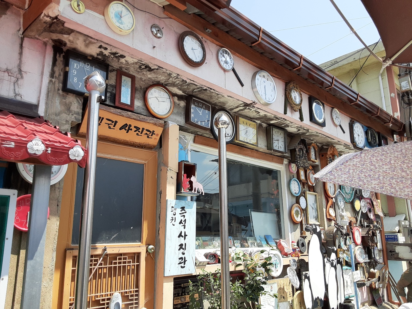 제일 먼저 도착한곳은 양림동 근대거리(역사문화마을)입니다 펭귄마을의 펭귄사진관입니다. 골동품 가게 같네요. 특히 벽걸이 시계가 많았습니다.