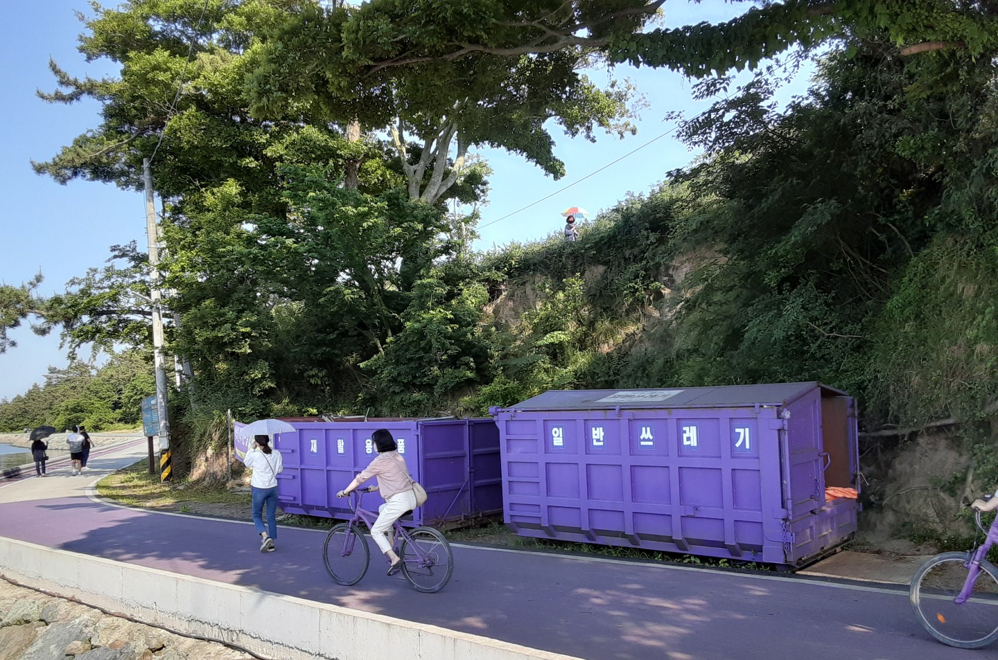 컨테이너 쓰레기통도 보라색이라 신기해서 한컷 했습니다. 자전거도 보라색이네요