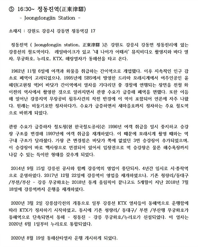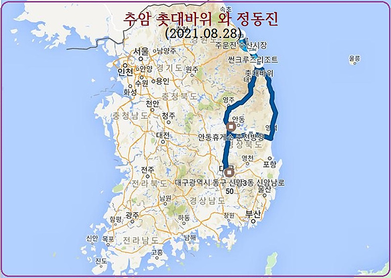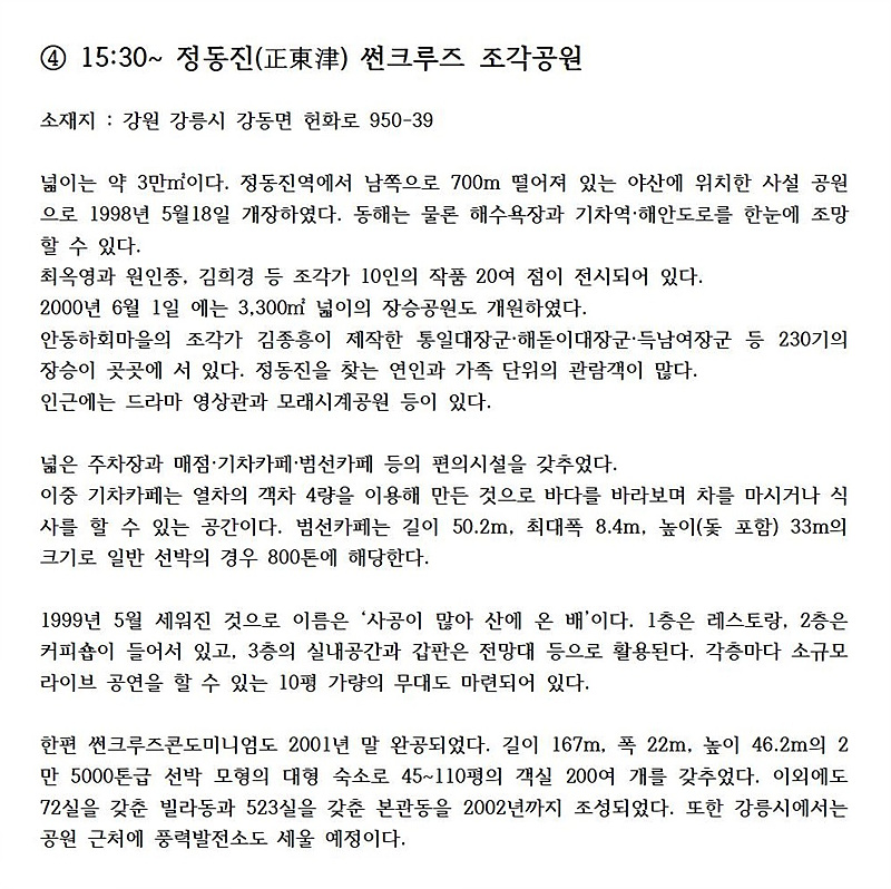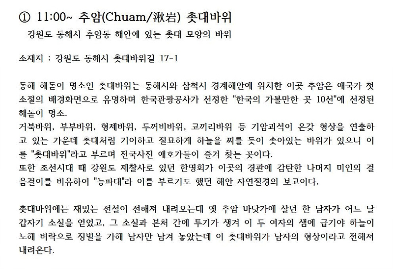 이번 추암과 정동진 투어에 '정동 심곡바다 부채길'에 낙석이 발생하여 통제됨에 따라 '정동진 썬크루즈 조각공원'과 '정동진역'을 대체하여 더 멋진여행이 되게 배려하신 삼성여행사 관계자와  장시간 야행에도 친절하게 안내 해 주신 김지혜 가이드님께 감사드립니다.