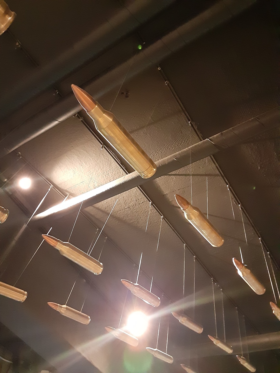 개의 탄알을 지붕에 메달아 놓았는 사진입니다.  방향은 우리를 가리키고 있습니다.
