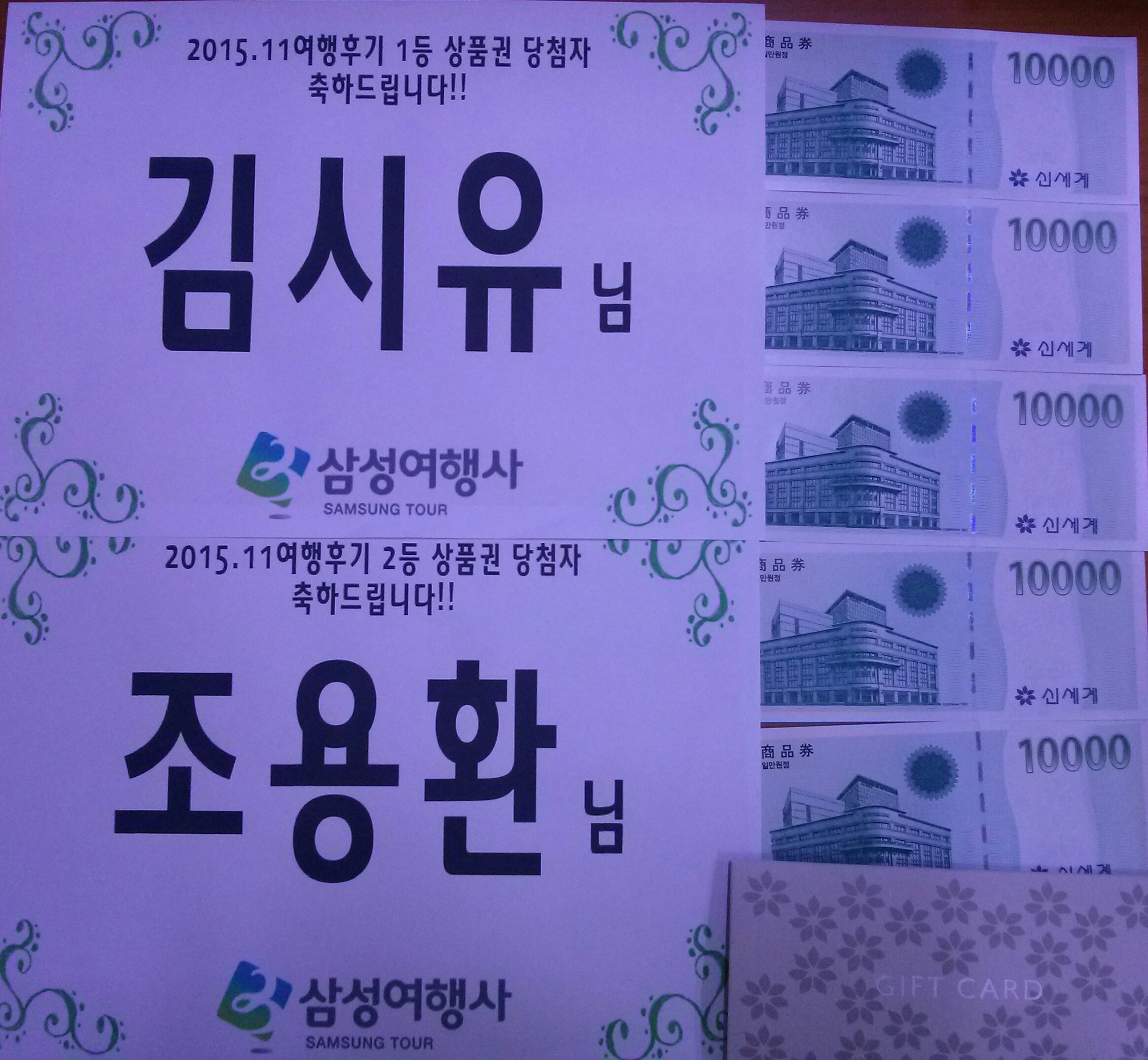 안녕하세요. 삼성여행사입니다~ 11월 여행후기 당첨자입니다! 11월에도 꾸준히 후기에 관심 가져주셔서 정말 감사드립니다. 12월에는 눈꽃기차여행 어떠신가요? 12월후기도 정말 정말 기대됩니다! 11월 후기이벤트에 선정된 분들은 아래와 같습니다.^-^ ★ 1등 백화점상품권(3만원) 당첨자 : 김시유님 010-7231-**** ★ 2등 백화점상품권(2만원) 당첨자 : 조용환님 010-9029-**** ★ 영화권 당첨자 : 총 17명(김시은~신동재님) ![]() 당첨되신 모든 분들 진심으로 축하드립니다. 상품권은 우편등기를 이용해 자택으로 보내드리며 영화표는 여행후기 등록 당시 핸드폰으로 보내드립니다. 감사합니다.^-^ |