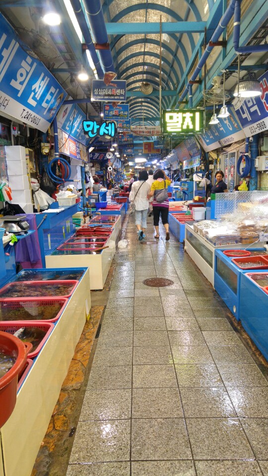 동해안 최대 규모의 포항 죽도시장에 도착했고 장바구니를 받고. 오징어와 쥐포로 장을 보고
