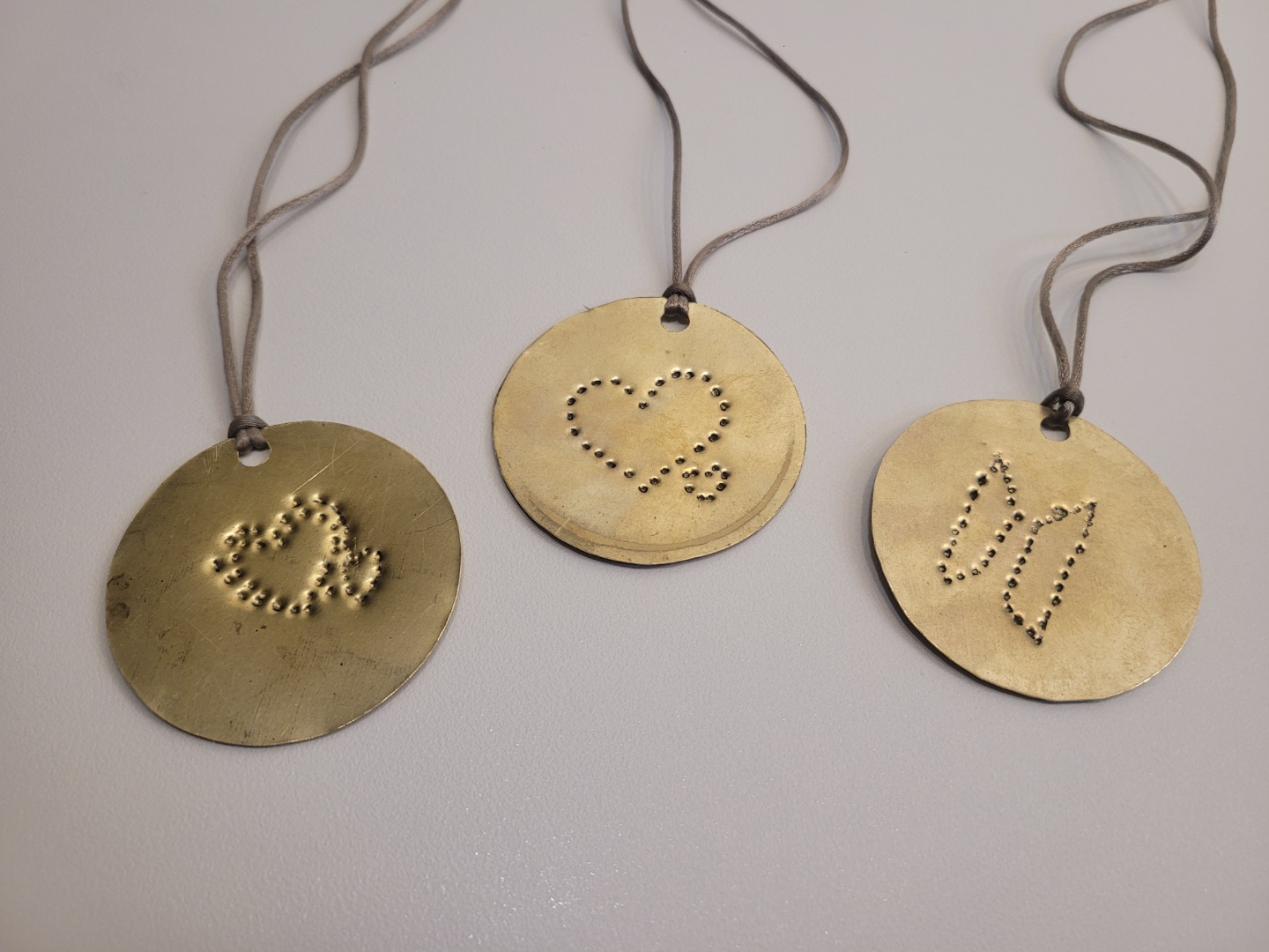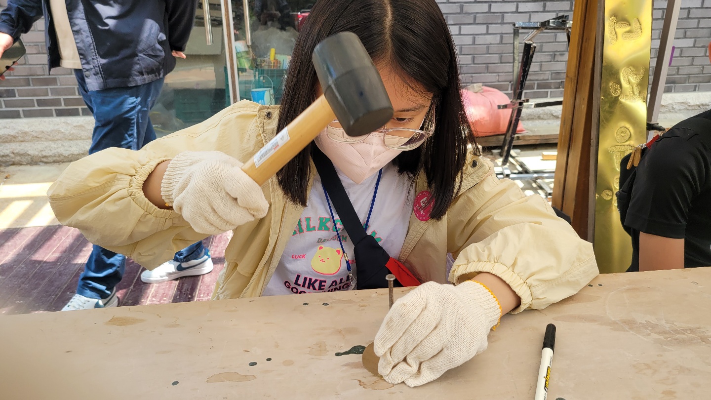 아이 주먹만한 동그란 철?? 같은 것에 밑그림을 그리고 못과 망치로 통통통 두드리면 멋찐 목걸이 완성!