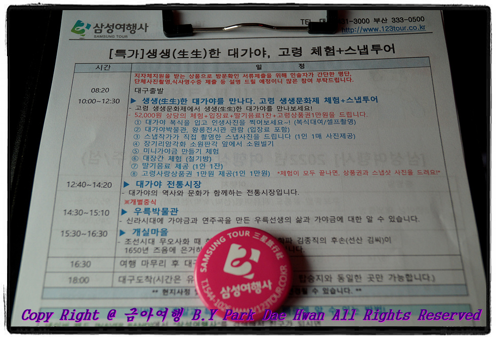 일정표와 삼성여행사 뺏지 입니다. 이 날 일정으로는 "생생한 대가야를 만나다 - 고령 생생문화제 체험" 부터 대가야시장 중식, 우륵박물관, 개실마을까지 둘러보는 코스였습니다. 대구와 가까운 곳에 여행금액이 38,000원이었지만 각종 입장료와 스냅사진 1장 받고 딸기주스 1잔에 고령사랑상품권 1만원권 제공이면 상당히 가성비 있는 여행입니다. 뺏지는 제 개인적인 생각이지만 입장료 받는 관광지에선 저 뺏지만 보여주면 바로 입장이 가능하기에 하이패스 기능도 되고 가이드님께서 저 뺏지를 보고 삼성여행사 고객님이시구나 하고 알아볼 수도 있고 사진도 찍어주시는 GPS 기능까지 2가지 기능이 있는 뺏지라고 생각합니다 ㅎㅎ