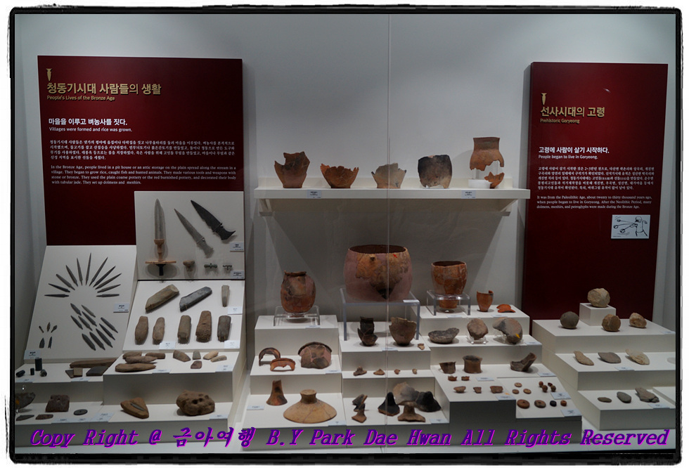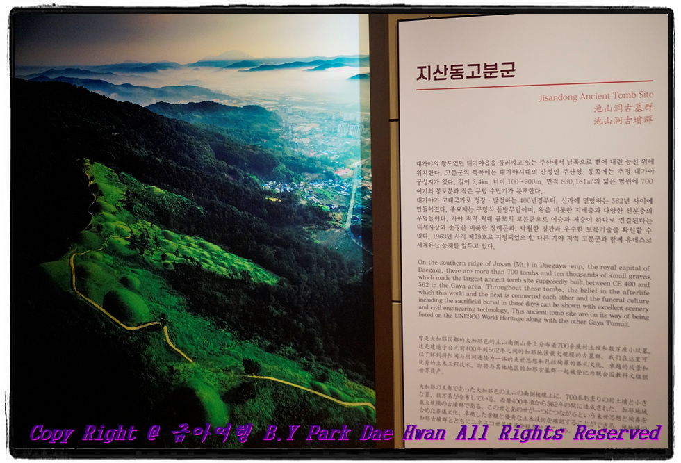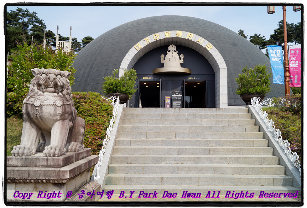 "고령 대가야박물관" 입니다. 대가야박물관은 세계 유일의 대가야사 전문 박물관 입니다. 고령은 대가야의 옛 도읍지이자 선사 문화의 중심지였습니다. 그리고 대가야는 풍부한 철과 좋은 농업 입지조건을 바탕으로 성장하였는데 소백산맥 서쪽까지 세력을 확장하고 신라와 결혼 동맹을 맺는 등의 과정을 거치며 5세기 후기 가야 연맹을 주도하기도 하였습니다. 대가야박물관을 둘러본 다음 "왕릉 전시관" 으로 이동하여 둘러보았습니다. 왕릉전시관은 국내에서 최초로 확인된 대규모 순장 무덤임 지산동 44호분의 내부를 원래의 모습 그대로 재현해 놓은 곳입니다. 경주 천마총은 실제 무덤 안으로 들어가서 관람을 하지만 왕릉전시관은 별도로 만들어진 전시관에서 본다는 점이 다릅니다.