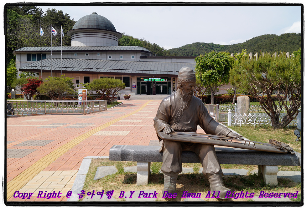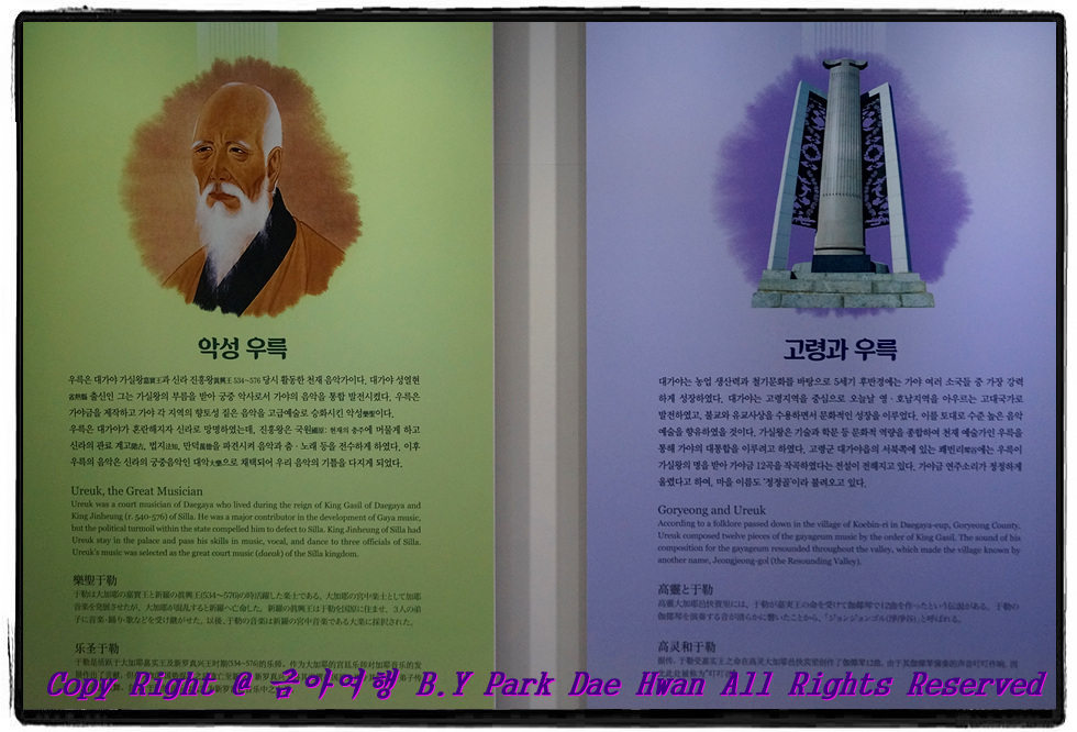 대가야시장 식사를 마친 후 다음 목적지로 "우륵박물관" 으로 이동하였습니다. 우륵박물관은 가야금을 창제한 악성 우륵과 관련된 자료를 수집하여 우륵과 가야금의 세계를 쉽게 이해할 수 있는 "우륵과 가야금" 전문박물관 입니다. 우륵은 대가야 가실왕 때에 활동한 우리나라 3대 악성의 한 사람 입니다. 가실왕의 부름을 받아 대가야의 음악과 춤, 노래 등을 통합 발전시키고 당시 전해지고 있던 여러 형태의 현악기를 토대로 가야금을 창제하여 가야금 12곡을 작곡한 사람이기도 합니다. 우륵박물관은 악성우륵과 가야금과 우륵에 대한 설명, 가야금 연주법, 가야금의 세계, 가야금의 변천사 등 가야금과 우륵에 대해 알 수 있고 잊혀가는 전통음악의 향기를 느낄 수 있는 곳입니다.