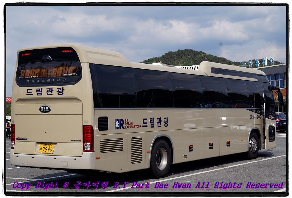 고령 생생문화재 체험과 대가야시장 식사, 우륵박물관 및 개실마을까지 모두 둘러본 후 버스를 타고 대구로 이동하였습니다. 대구로 이동하는 중 논공휴게소에 잠시 휴식하였으며 휴식 때 찍어본 드림관광 7999호 입니다.