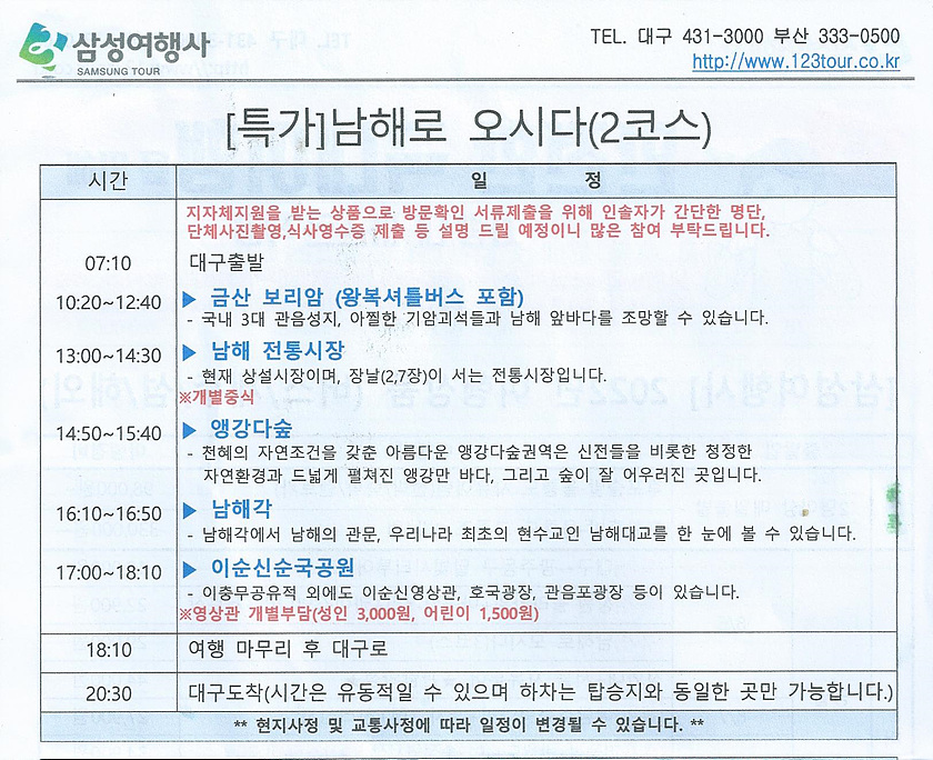 경남(慶南) 남해군(南海郡) ①보리암(菩提庵) ②남해전통시장(南海傳統市場) - 점심 ③앵강(鶯?)다숲 ④남해각(南海閣) ⑤이순신순국공원(李舜臣殉國公園)