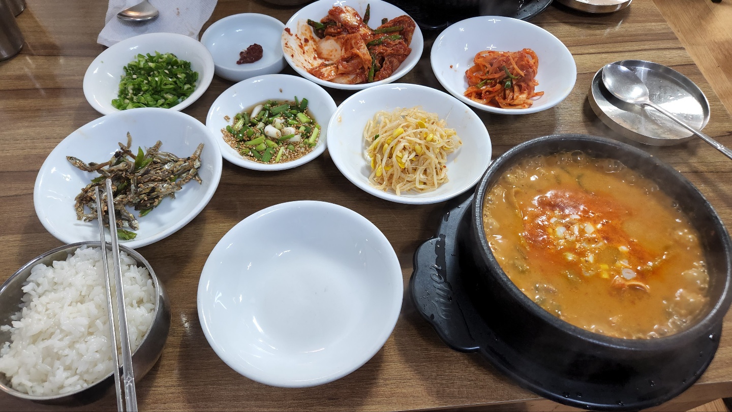 그 중 힘겹게 찾아 네이버지도로 평점이 괜찮아 보이는 추어탕집을 골라 들어갔다. 실내가 시원해서 그나마 탕을 먹을수 있었는데, 우리가 들어왔을 때 주문할수 있는 추어탕이 마지막이였다고 한다. 걸죽한편의 국물과 시래기와 반찬들이 집밥같고 자극적이지 않아서 좋았다. 대구에서는 산초가루를 넣으라고 주는데, 여기서는 젓갈에파담긴 액젓을 주어서 새로웠다. 나름 이동네 맛집을 온 것 같아 맛있게 먹고 나왔다.