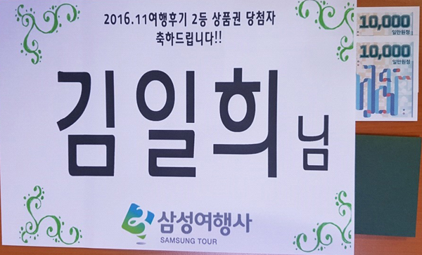 안녕하세요 삼성여행사입니다~ 11월 여행 후기 당첨자입니다! 이제 어느덧 2016년의 마지막 달이 되었는데요. 저희 삼성여행사와 함께 해맞이를 하시며 한해를 마무리 해보는 것은 어떨까요? 11월 후기 이벤트에 선정된 분들은 아래와 같습니다.