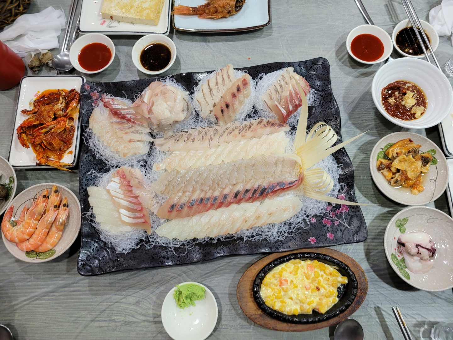 안목해변에서 기념컷도 하고 경포해변을 바라보며 모듬회정식을 먹으며 정겨운 애기꽃을