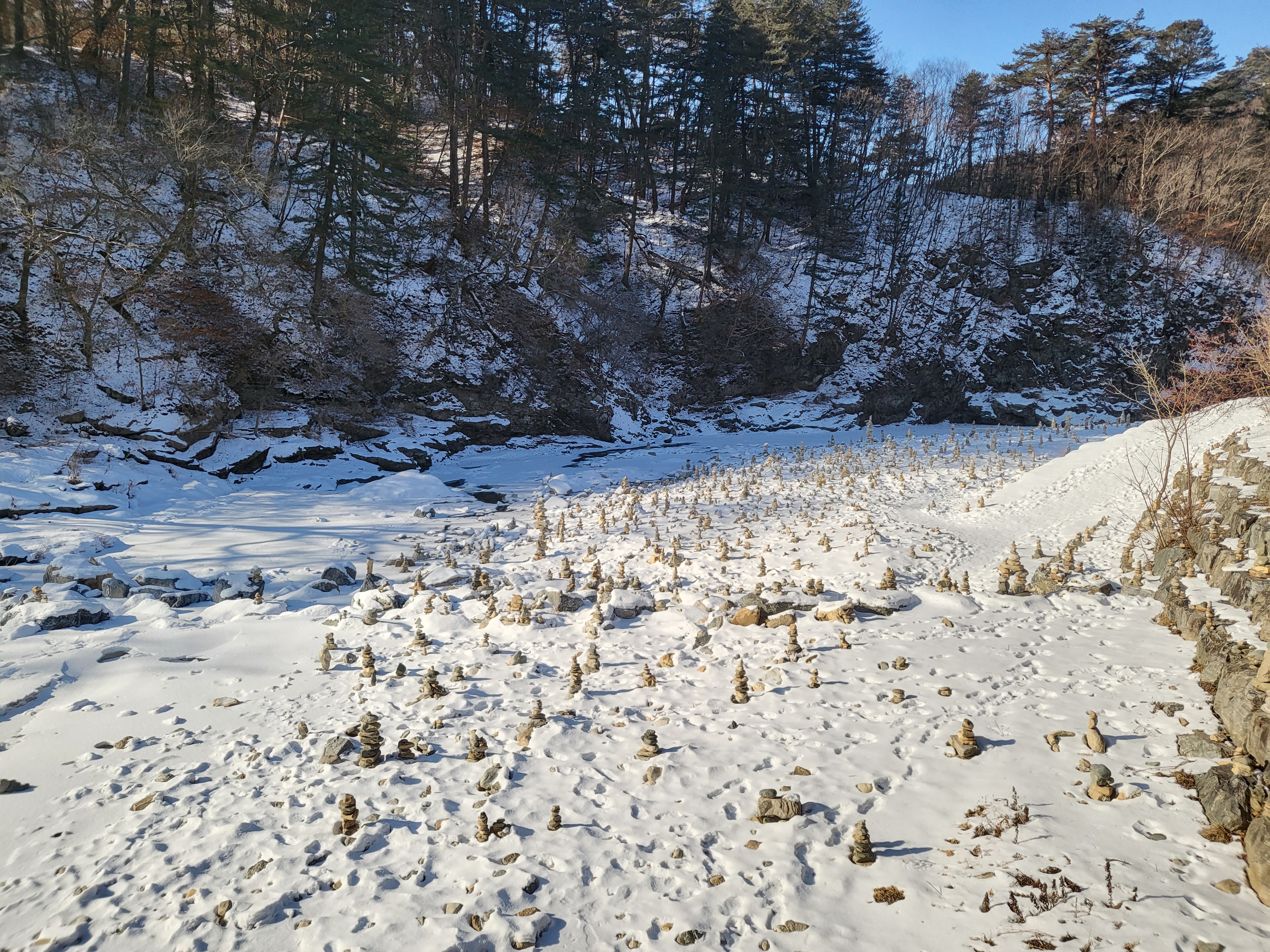 눈 쌓인 바닥에 돌탑이 가득했는데 다들 감탄하며 사진을 찍으시더라구요그만큼 장관이었습니다.