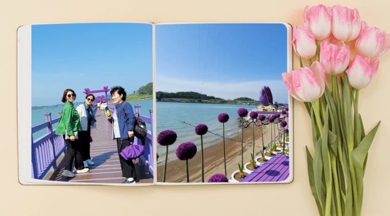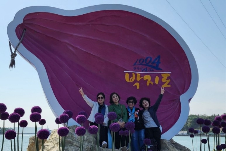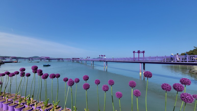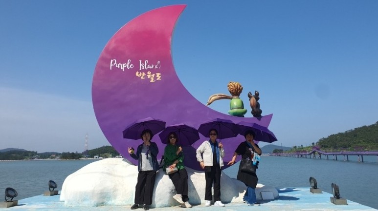 5월 초록이 너무 싱그러운 계절 하늘은 푸르고 깨끗하다. 오늘의 여행지는 전통과 현대 문화 결합된 선교문화 유적지, 양림동 근대 거리와 1913년에 시작되어 올해로 100년이 된 송정역시장을 거쳐, 안좌도, 반월도와 박지도로. 연결된 산책로..라고 한다. 섬 전체가보랏빛으로 가득하다. 마을 전봇대와 지붕, 건물과 도로, 편의 시설을 포함 퍼플샵. 가게에서도 보라색이 아닌 것이 없다. `여행 좀 즐긴다.는 친구(우인)들과 딱 좋은 계절에 퍼플 섬에서 신비롭고 우아한 보라가 주는 매력에 흠뻑 빠진 시간. 하늘과 구름과 바다와 햇살 바람과 함께 서로 앞뒤로 번갈아 걸으며 사진 찍고, 이야기하고. 또 맛있는 음식도 먹으며...