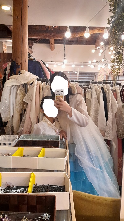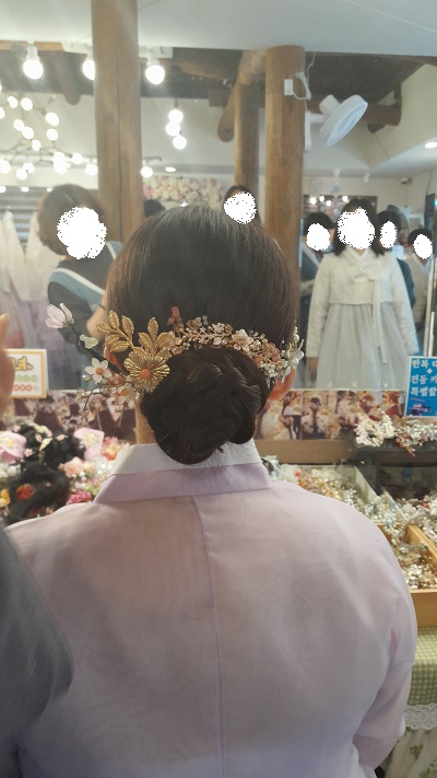 그렇게 해서 임실에서의 오전이 지나갔다. 우리는 새로운 기대를 품고 전주로 1시간 30분을 달려 도착했다. 전주에서는 그냥 한복 입고 돌아다닌 것밖에 기억에 없다. (ㅋㅎ) 전주 한옥 마을 거리를 지나면서 한 샷! ![]() 우리는 곧장 한복대여점에서 직접 한복을 고르고 입어보았다. 여자 한복은 입기가 까다로워서 탈의실 안에서 직원분들이 입는 것을 도와주었다. 나는 캉캉 치마를 입고 엄마는 그라데이션 치마를 입었는데 둘다 대여비 1만 원씩 더 내야 했다. 옷만 입으면 좀 아쉬운데…. 라는 마음이 들었는데 탈의실을 나오자마자 머리를 예쁘게 묶어주시는 직원분들이 3분 계셨고 우리는 거기서 줄을 섰다. 동생 먼저 머리를 묶었다. 머리는 주로 여성이, 댕기 머리, 반묶음, 올림머리를 할 수 있는데 하나같이 모두 아름다워서 고르기 힘들었다. 열심히 머리를 고르고 있는데 순식간에 머리를 다한 동생이 처음으로 공주님(?)이 되어있었다.