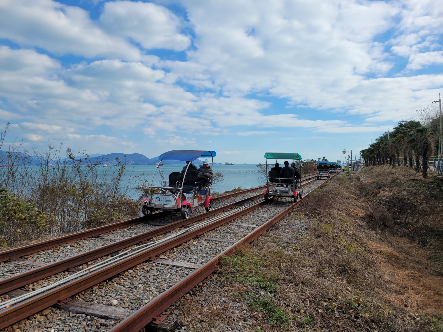 탁트인 해안가를 바라보며 레일바이크를 타며 웃음꽃을 피우고
