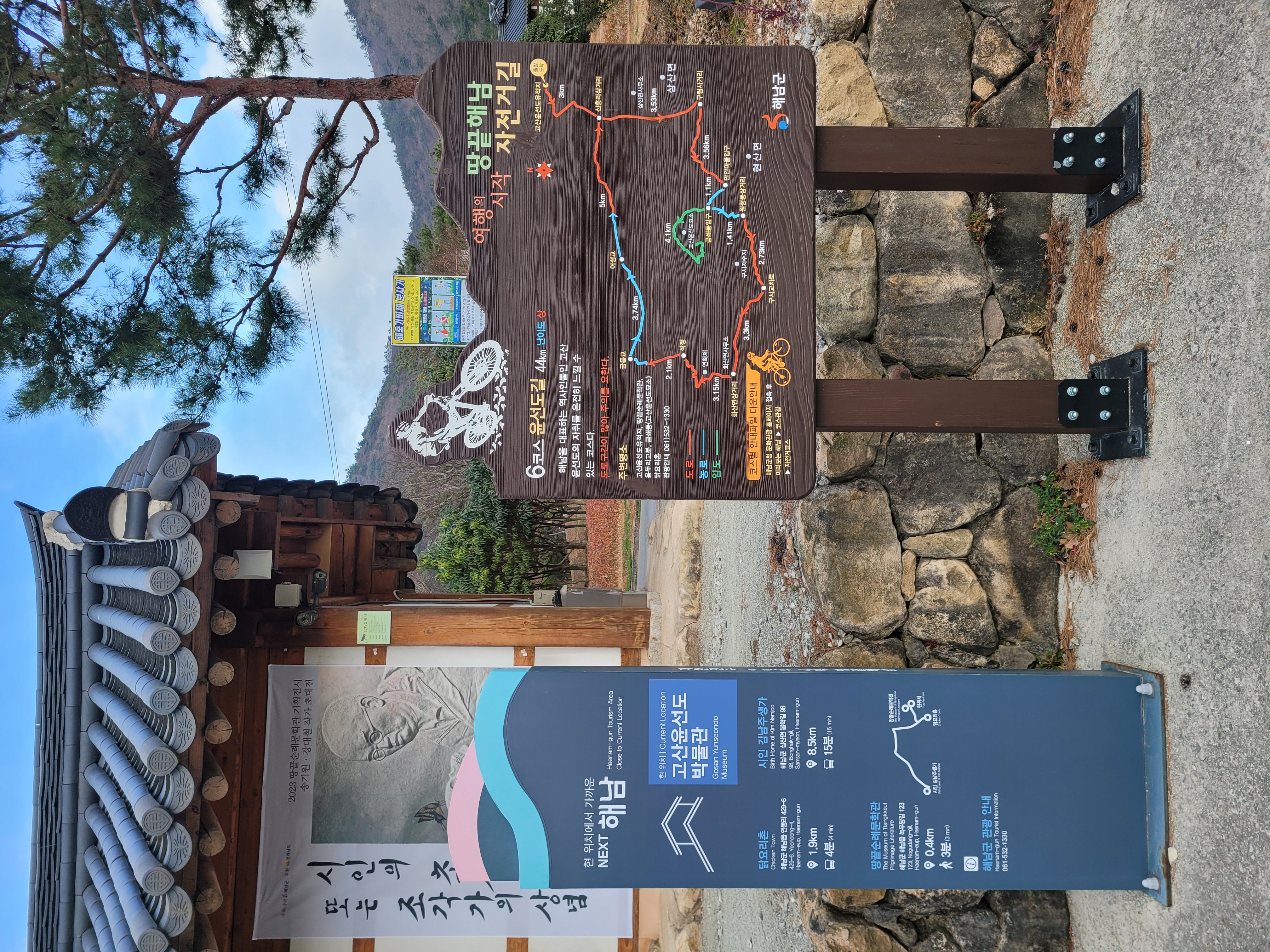다음 도착지는 녹우당, 고산 윤선도 유적지로 입장은 무료였습니다. 해남 자전거길 중 6코스가 윤선도길이라고 할 정도로 해남에선 윤선도 유적지가 유명한가보다. 녹우당을 비롯해, 아래로 내려가면 땅끝순례문학관, 고산 윤선도 박물관이 있었다. 무료로 시 하나 뽑아봤다.녹우당 옆에는 아주 큰 나무도 있었다. 산책길을 걷다보니 마음이 정화되는 기분이 들었다. 중간에 쉴 수 있는 정자와 벤치도 있었다.