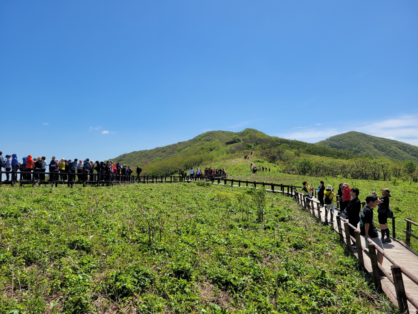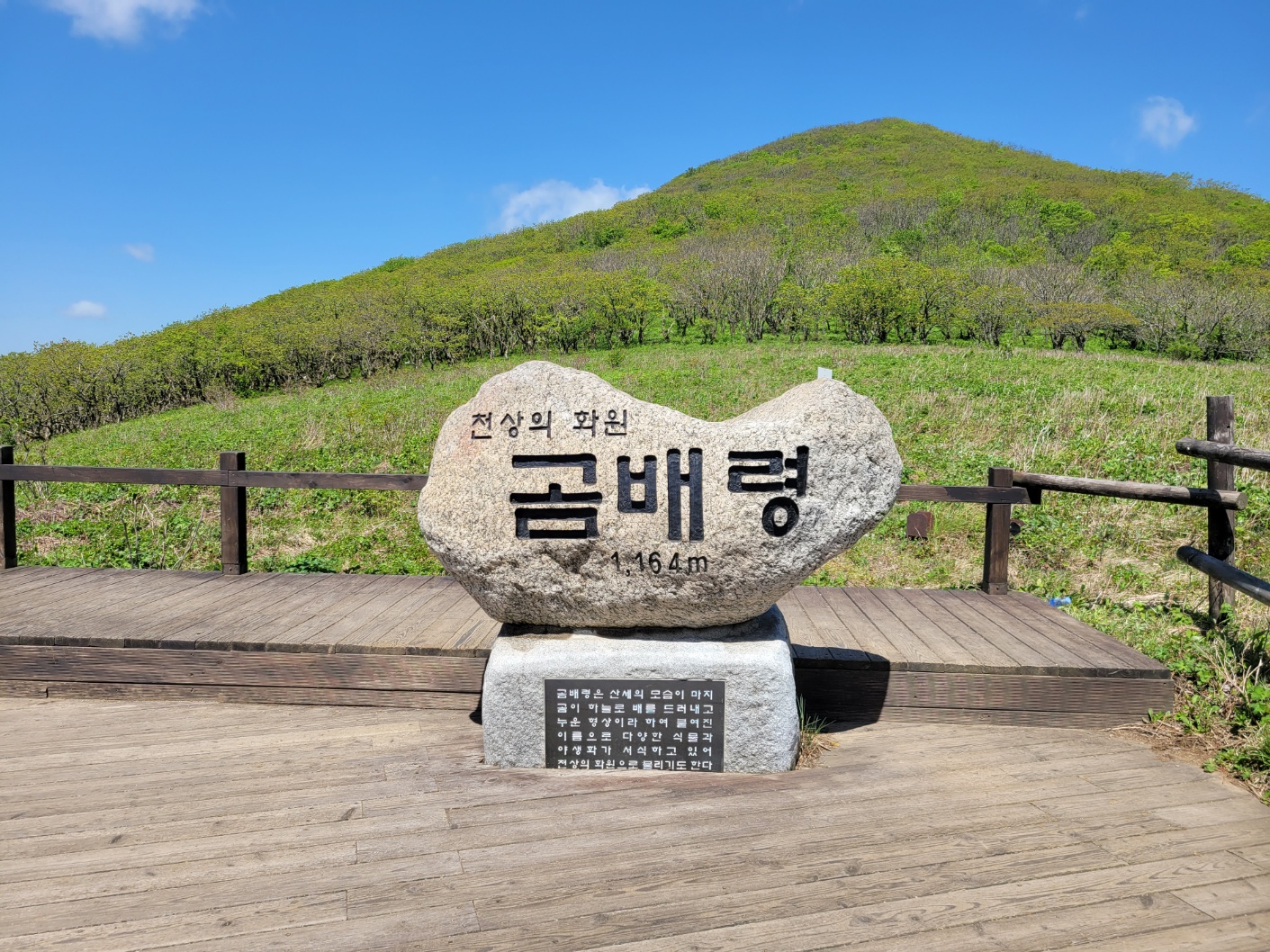 길가로 야생화가 만발하여 군락을 이루고 정상에 올라 곰배령의 탁트인 정경과 표지석을 배경으로