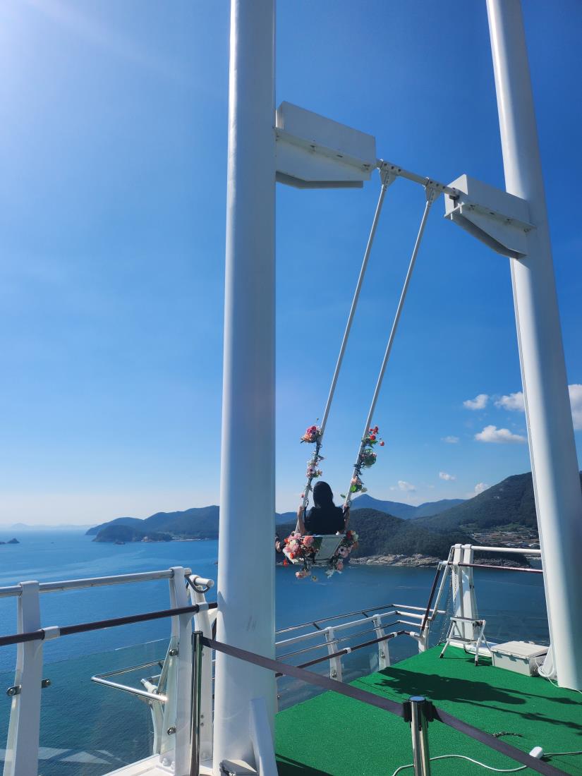 설리스카이워크이 전망대에서는 360도 바다를 내려다 볼 수 있는 남해 최고의 전망대입니다 유리 바닥 아래는 고소공포증을 유발하는 느낌같이 짜릿하고 스윙그네 너머에는 경치가 한 몫해서 손님들 웃는 모습이 인상깊습니다