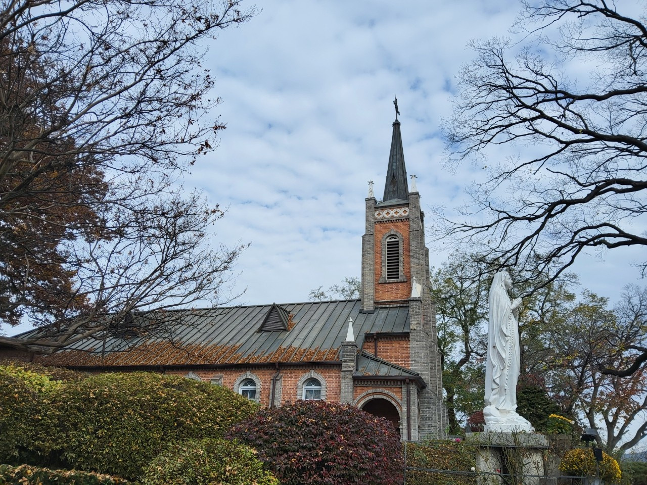 공세리 성당은 벽돌로 지어진 예쁜 오래된 성당과 오래된 커다란 나무들의 풍경이 유럽에 온거 같은 생각이 들었어요.