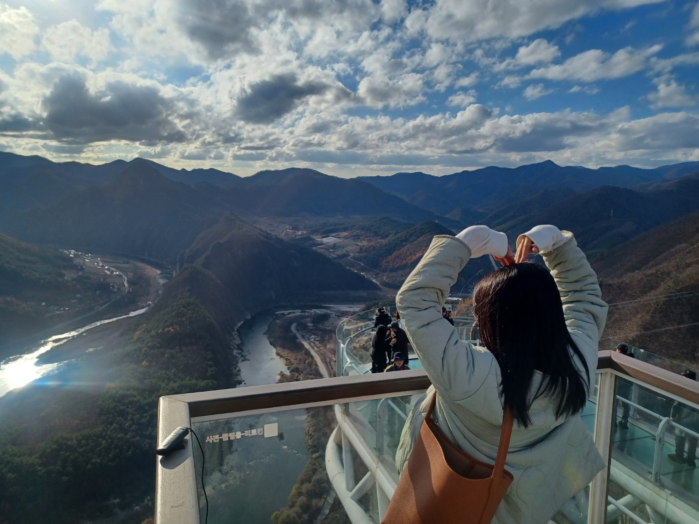 이후 병방치 스카이워크로 이동했습니다. 생각보다 규모는 작았지만, 유리바닥과 유리벽 덕분에 색다른 아찔함을 느낄 수 있었습니다. 특히 산 위로 조금 더 올라갔을 때 발견한 장소는 정말 좋은 곳이었고, 경치가 너무 아름다웠습니다. 자연 속에서 여유를 즐기며 사진도 찍고 힐링하는 시간을 가질 수 있었습니다.