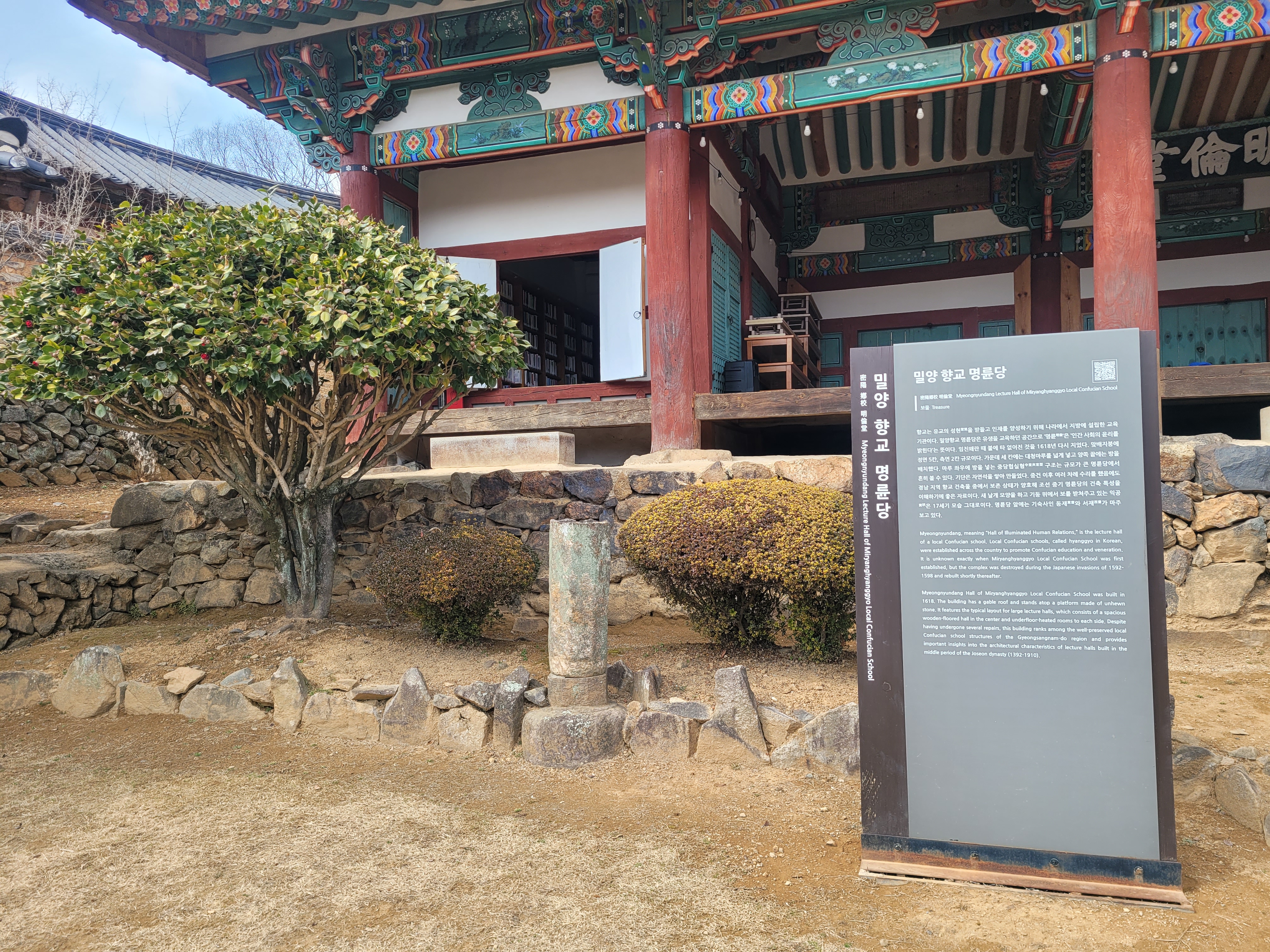 항교에 들어서기 전 전통 가옥이 밀집해 있는 밀양 손씨 집성마을이 있었다. 조선시대 공익 교육기관인 밀양 항교에는 대성전,풍화루, 명륜당 등이 있었고, 부근에는 모던하고 감각적인 카페도 있어 사진찍기 좋았다.