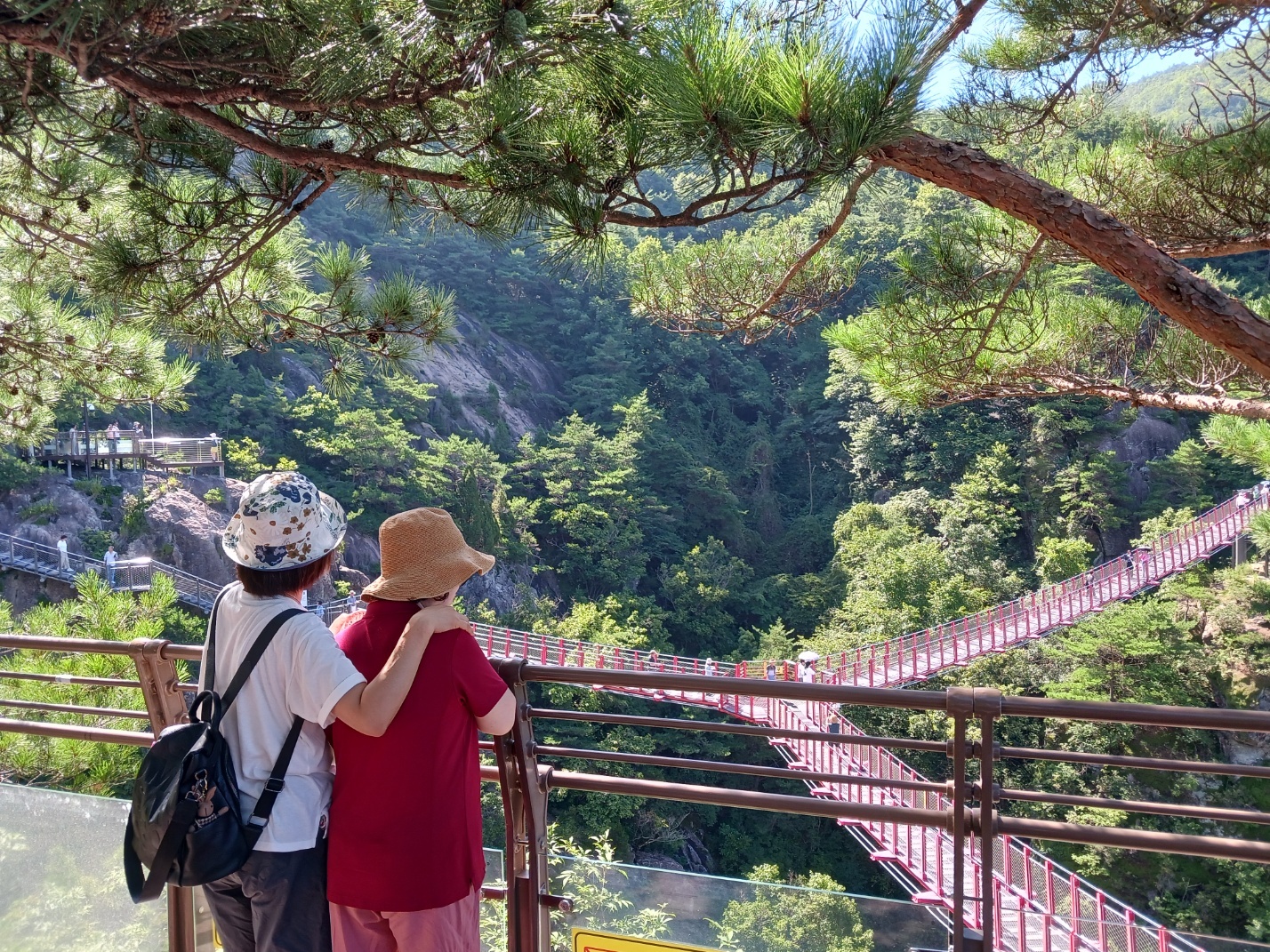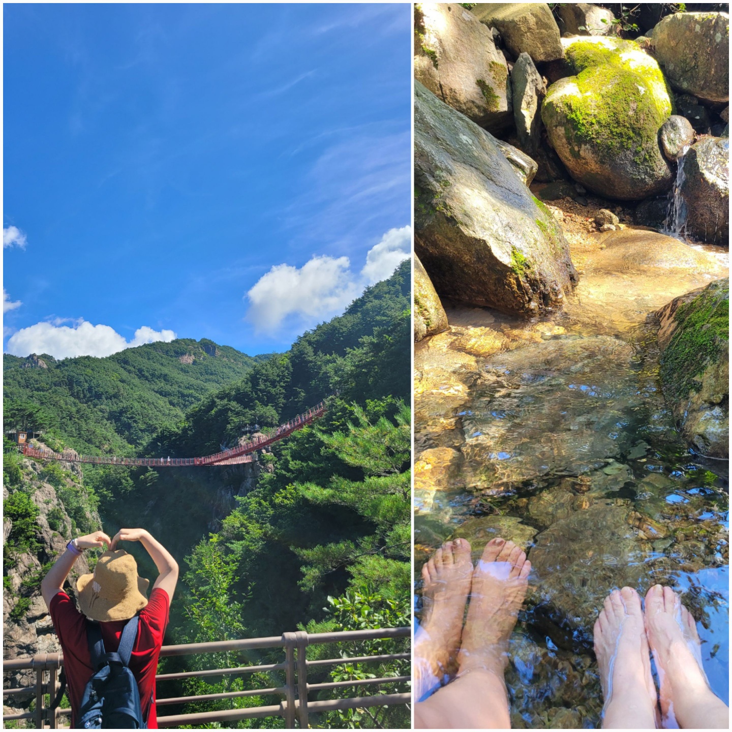 Y자형 출렁다리가 있는 출발지는 항노화힐링랜드라는 곳이었다. 산림휴양관이며 몇가지 시설들도 잘 준비되어 있었다. Y자형 출렁다리까지 가는 길은 567계단 산길과 숲길이었고 계단마다 '520/567' 이렇게 남은 계단수와 전체 계단수를 표시해 두고 짧지만 좋은 글귀들이 적혀 있었다. 가끔 불어오는 산바람이 없을 때는 깊은 골짜기와 우거진 나무숲이 무색하게 찌는 듯한 무더위였는데, 걸음이 느린 일행들을 일일이 챙기며 “괜찮아요, 시간 넉넉해요”라며 보폭을 맞추는 가이드님 덕분에 출발하면서, "가다가 너무 힘이 들면 중간에 돌아와도 된다"는 설명도 있었지만 한 분도 빠짐없이 정해진 코스를 끝낼 수 있었던 것 같다. 그 ‘넉넉한’ 시간 덕분에 계곡물에 발도 담그며 잠시 더위를 식히기도 했다.