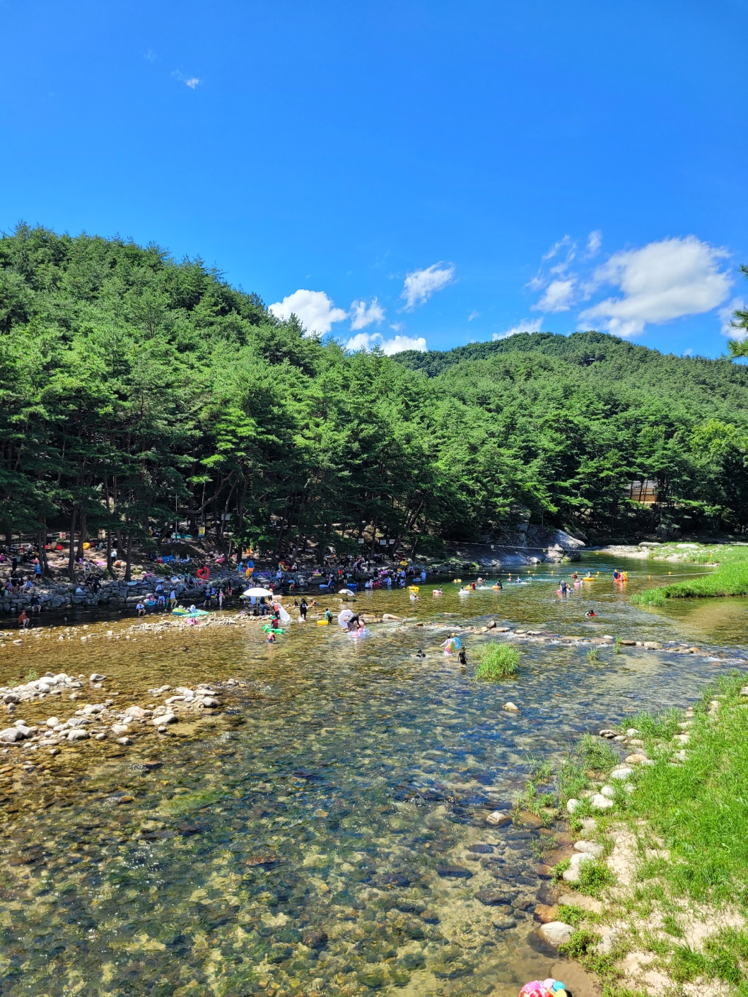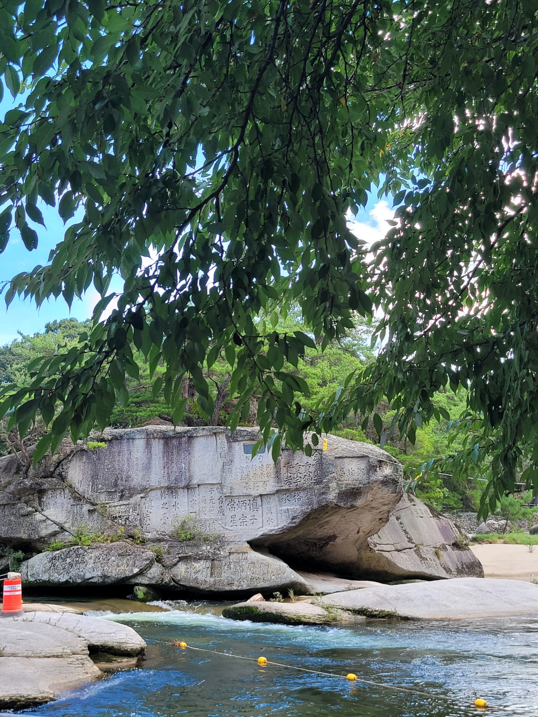 세 번째 목적지인 수승대는 속세의 근심 걱정을 잊을 만큼 풍경이 빼었났다고 이름이 난 장소인 만큼 물이 맑고 시원한 계곡이었다. 수많은 관광객이 가득했지만, 넓은 계곡과 울창한 나무 그늘 덕분에 북적임보다는 활기가 느껴졌고 아이들부터 어른까지 물놀이에 하는 모습이 자유롭고 즐거워보였다. 군데군데 안전요원이 지켜주니 안심도 되었다. 나무 그늘 아래 시원한 바위에 앉아 쉬었고, 일부 일행은 다시 수승대 출렁다리를 다녀오기도 했다.