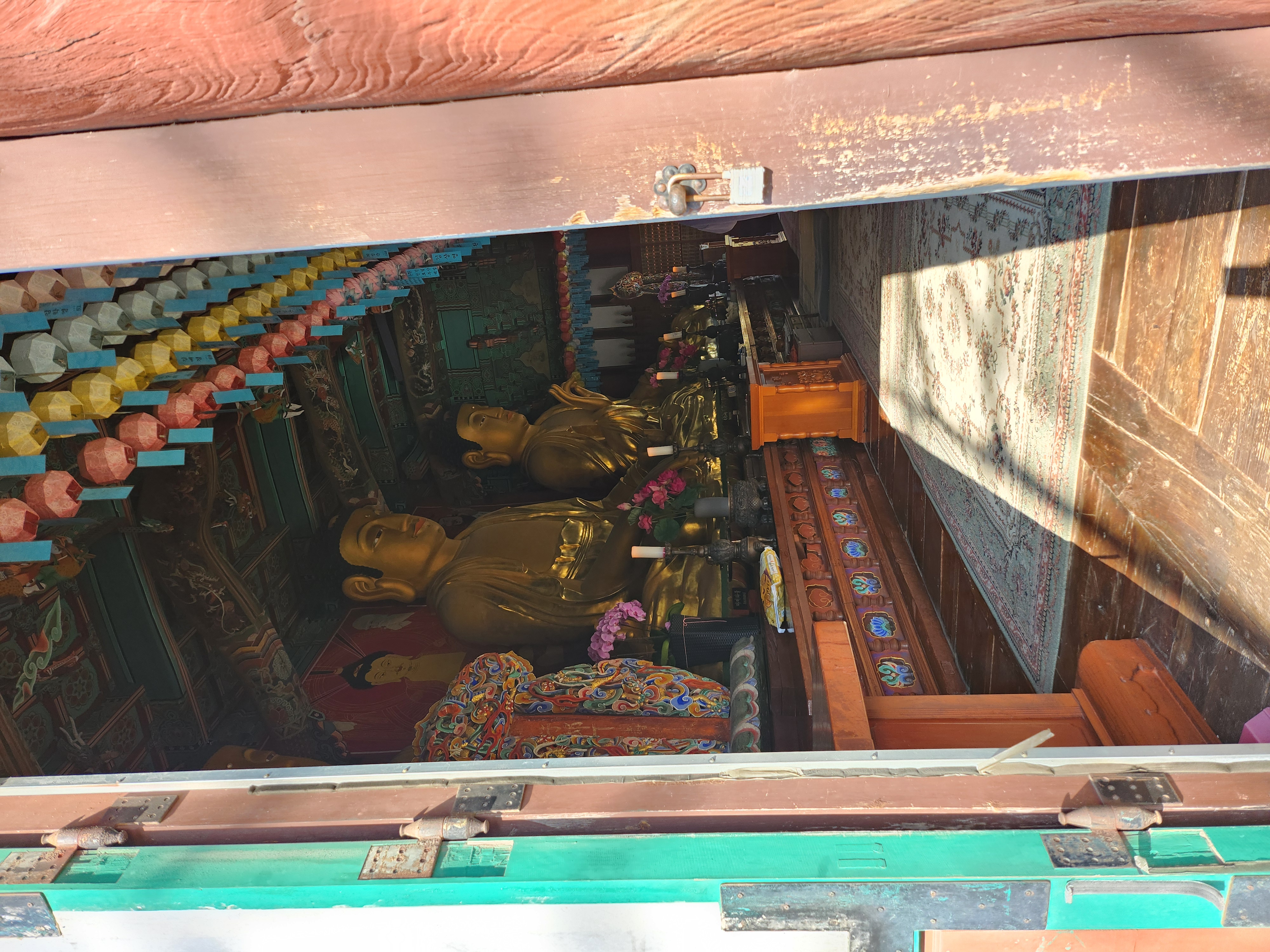 부처님 상이 거대하게 계셨습니다. 부처님 상 앞에서 스님이 합장을 하신 모습을 뵈면 침묵하면서 엄숙해지고, 또 평화로워지는 묘한 느낌이 듭니다. 불교에 관한 소설을 읽으며 몸에 소름이 돋았던 무척 감명 깊었던 기억이 나기 때문일까요? 해설자처럼 절의 이름 가장 첫 음절에 악센트를 넣고 절을 되뇌어야 할 것 같은 느낌이 드네요.