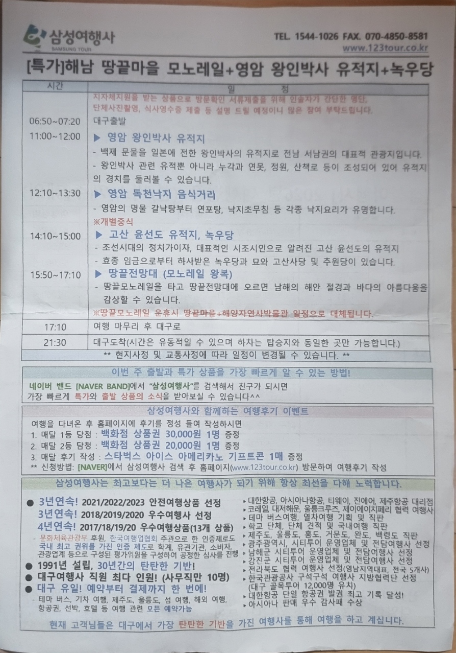 앞으로도 좋은 관광지를 착한가격에 개발하여 더욱더 알차고 유익한 여행이 될수 있도록 삼성여행사에게 부탁드리며 그런 알차고 유익한 여행에 같이 동참할 수 있도록 해야겠다는 생각을 해본다